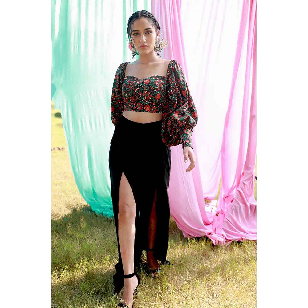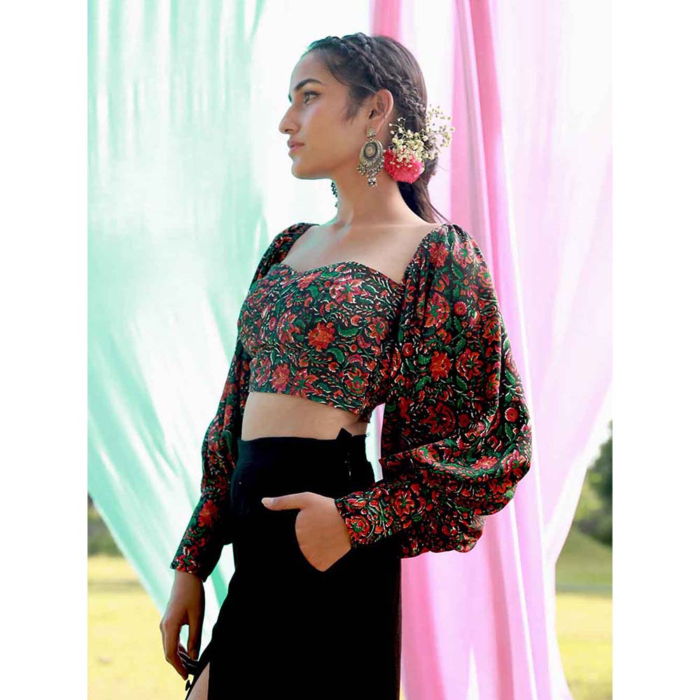 Description : Spotlight's on you, shawty! These solid black pants will make that happen, as they feature an interesting button down detail, so you can wear it all buttoned up or can show off those legs with high slits. The pants also have side seam pockets and an elasticated waist for comfort. These pants come with a beautifully hand block printed crop top with voluminous bishop sleeves and a long cuff, that can also be worn as an off shoulder.