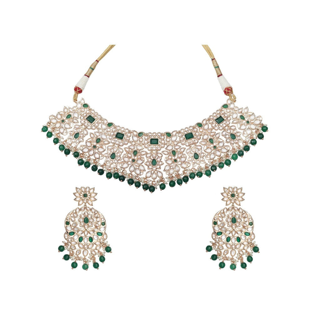 Description : Gold Finished Kundan Polki Choker & Long Necklace Set Embellished with Emerald Green Stones and Delicate White & Green Beads.Includes One Choker, One Long Necklace, One Pair of Danglers and One Matha Patti.Choker : Width 8" x Height 2.5", Complete Length 17"Earrings : Width 1.7" x Height 3.2"Matha Patti : Length 14" x Height 7"Pendant : 2" Necklace : Length 20" , Complete Length 23.5"Elevate your style with this opulent gold finished Kundan Polki Choker & Mala set. Adorned with dazzling Emerald Green Stones and intricate White & Green Beads, the set includes a captivating Choker, a stunning Mala, a pair of elegant Danglers, and a graceful Matha Patti. A perfect ensemble to radiate charm and grace on special occasions.