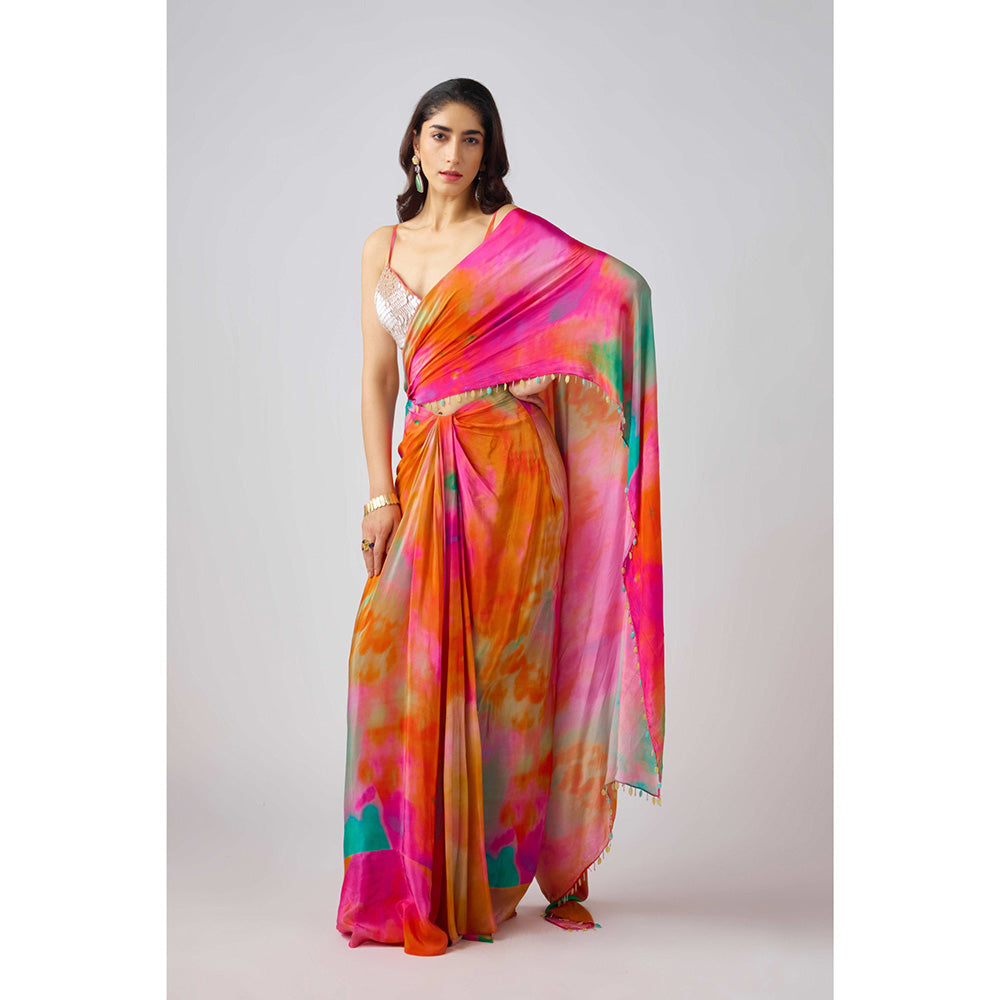 Description : Make a style statement with this multi-color pre-draped saree from Basanti Kapde aur Koffee. Crafted from crepe, this beautiful saree is finished with a sleeveless design and shoulder straps. Complete the look with a pair of heels and statement jewellery.