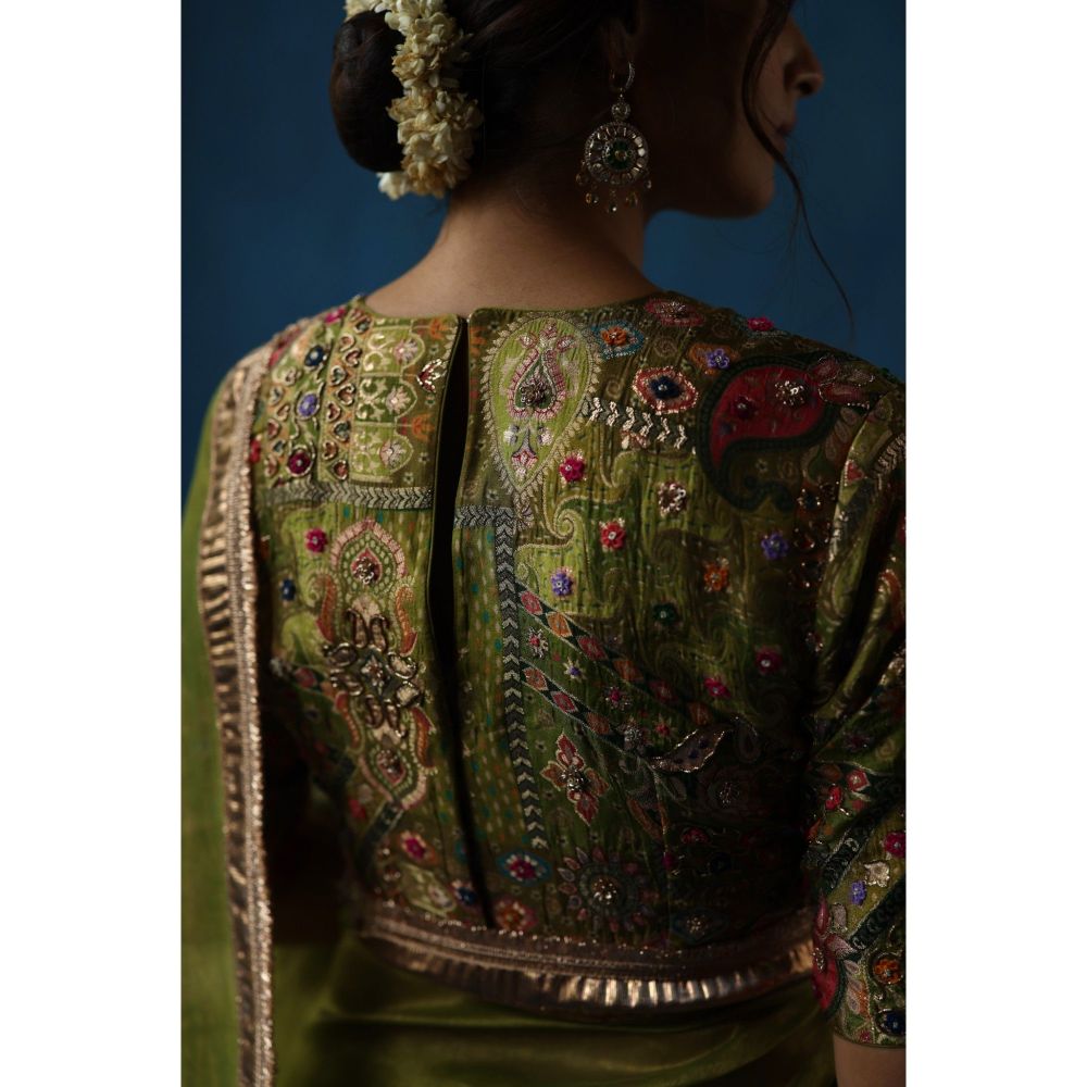 Begum Pret Green Sharbat Embellished & Zari Work Saree with Blouse with Stitched