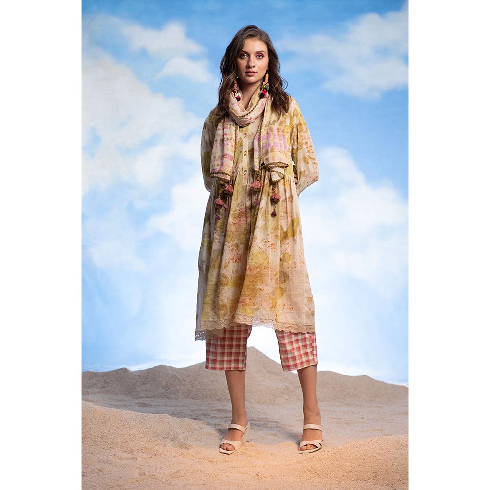 Description : B& Collar Front Open Gathered Kurta with Check Pants & Tie Dye Stole