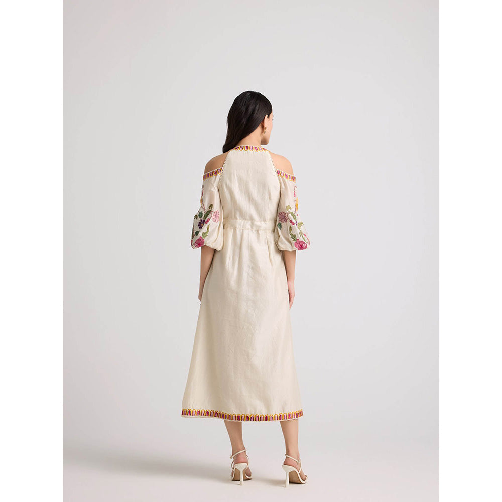 Description : Ivory Chanderi Floral Chainstitch Threadwork And Beadwork Cold Shoulder Midi Dress.