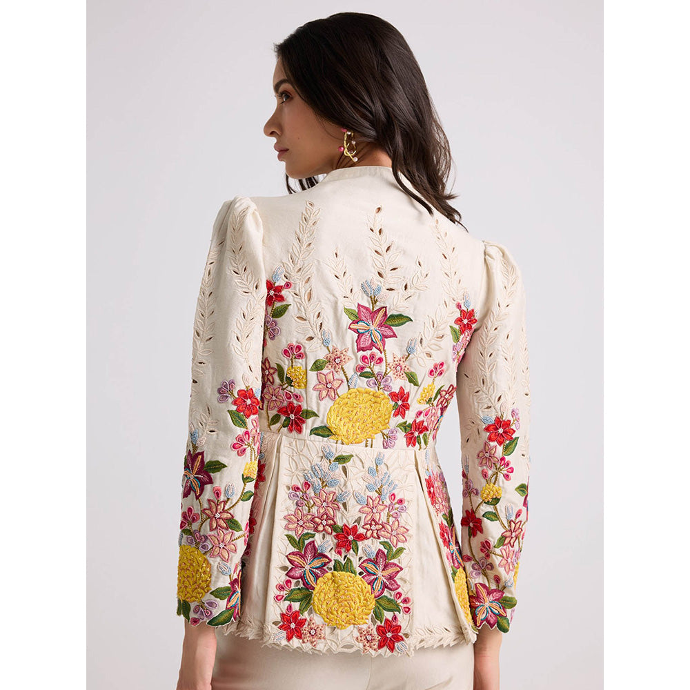 CHANDRIMA Ivory Floral Threadwork Pleated Jacket