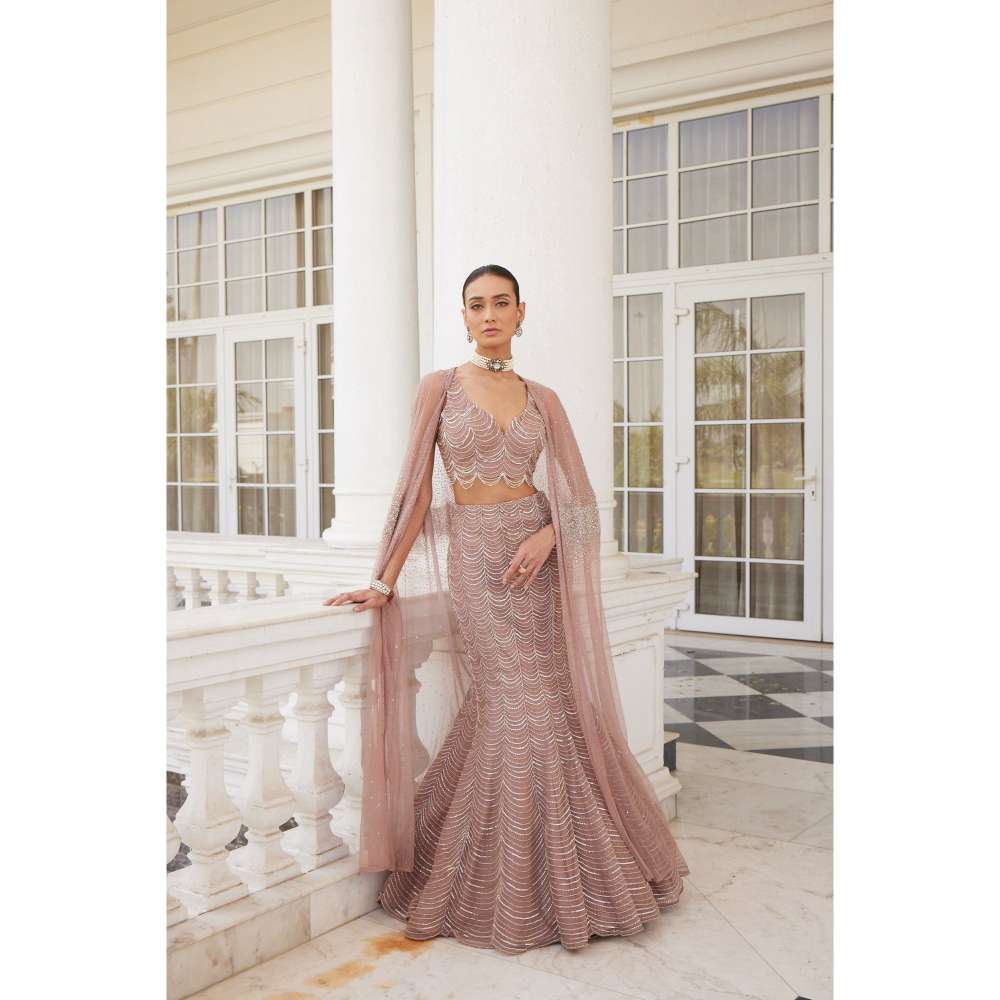 Description : Leave the crowd spellbound by stepping out in this captivating siona salmon pink skirt with blouse & cape from Charu and Vasundhara. Made from high-quality net, this piece features full embroidered heavy lehenga with embellished blouseand cape. Style it with minimal jewellery and sandals to complete the ensemble.