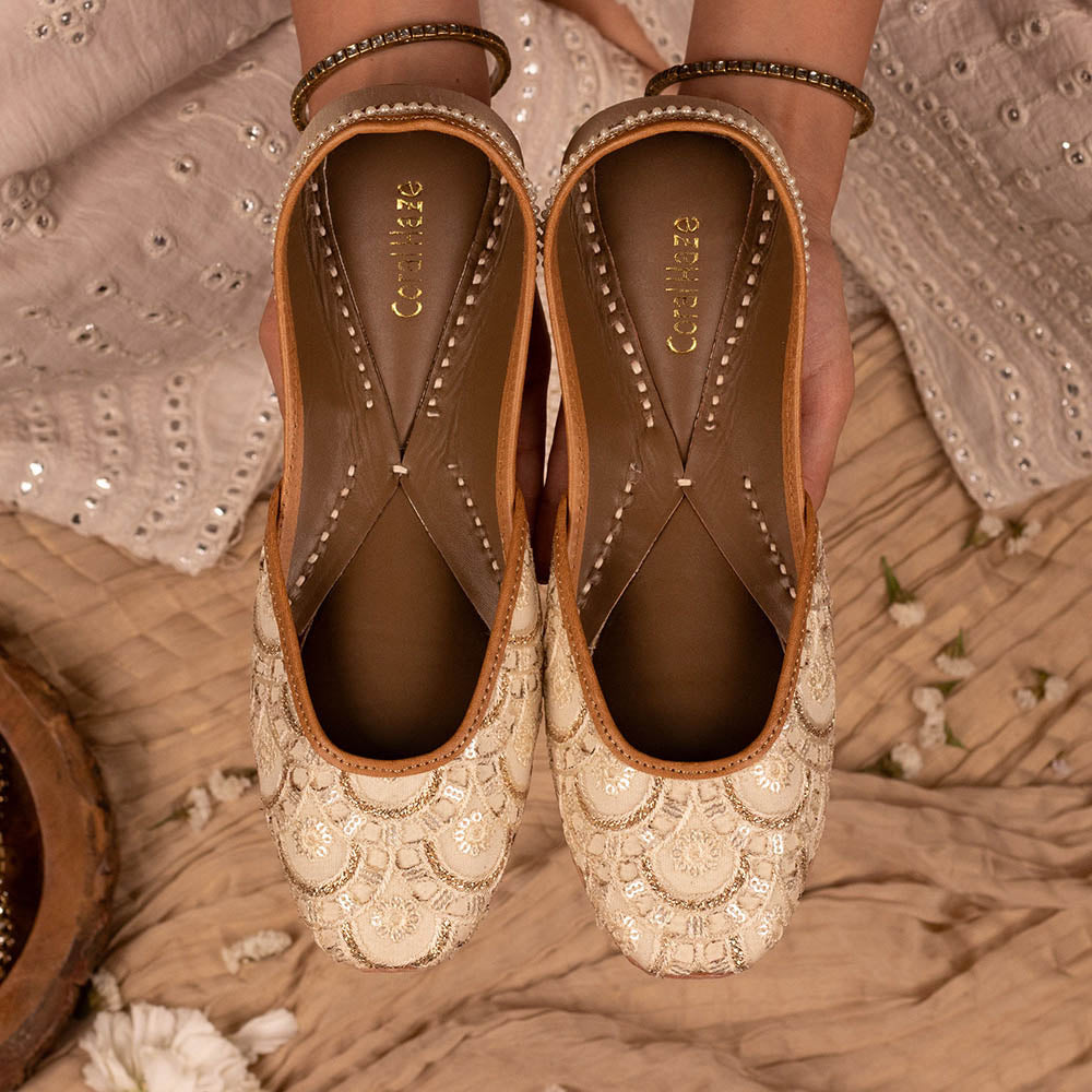 Description : Complete your look with these adorable ivory and gold threadwork juttis with gold fringe detailing at the back from Coral Haze for any occasion. These shoes feature gorgeous color and trendy style that will look perfect with your favorite outfit.