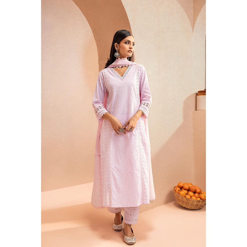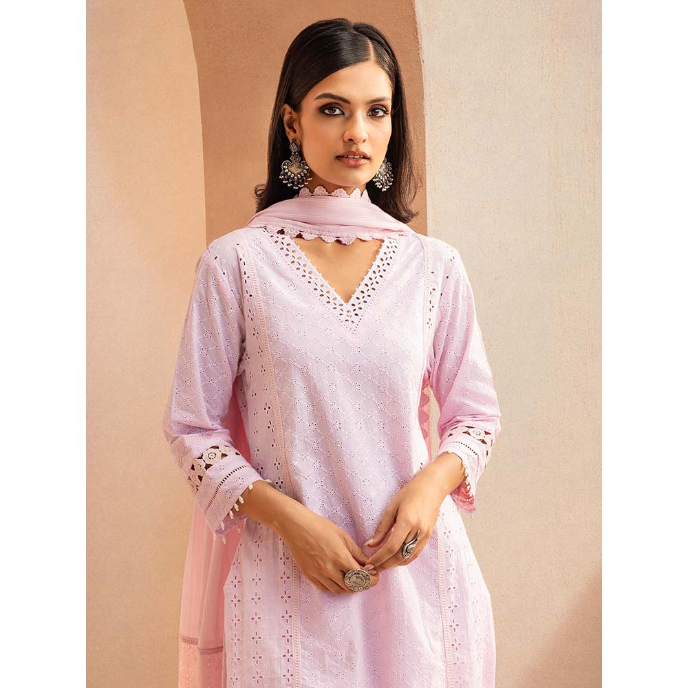 Zoya Pink Schiffli Embroidered Cotton Kurta with Pant and Dupatta (Set of 3)