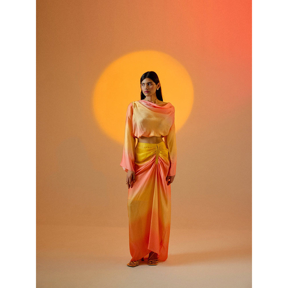 Description : Echo Tea rose skirt set “ a vibrant and stylish ensemble designed to captivate attention and radiate modern femininity. The set features a cropped top with full sleeves and a graceful cowl neck, perfectly paired with a skirt adorned with ruched detailing on the waist, a side zipper, and an asymmetrical length. Get ready to embrace the playful beauty of ombre colors and contemporary design. A lively ombre effect in luxurious satin adds a burst of color and energy to your outfit .The side zipper ensures easy wearability, allowing you to slip into this charming set effortlessly. This detail adds convenience without compromising the sleek and streamlined appearance .Transition seamlessly from day to night by pairing this set with your favorite accessories and footwear. Whether it s a brunch date, a daytime event, or a night out, this ensemble adapts to various settings .The combination of ombre colors, ruched detailing, and asymmetrical length creates an effortlessly playful and chic look. This set is designed for those who appreciate fashion with a touch of whimsy. Meticulously crafted with attention to detail, this skirt and cropped top set are lined to ensures both style and durability.