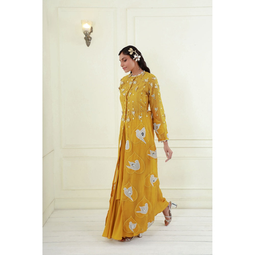 Description : Yellow Organza Bird Embroidered Full Sleeve A Line Jacket, Honey Gold Silk Blouse and Honey Gold Silk Draped Skirt
