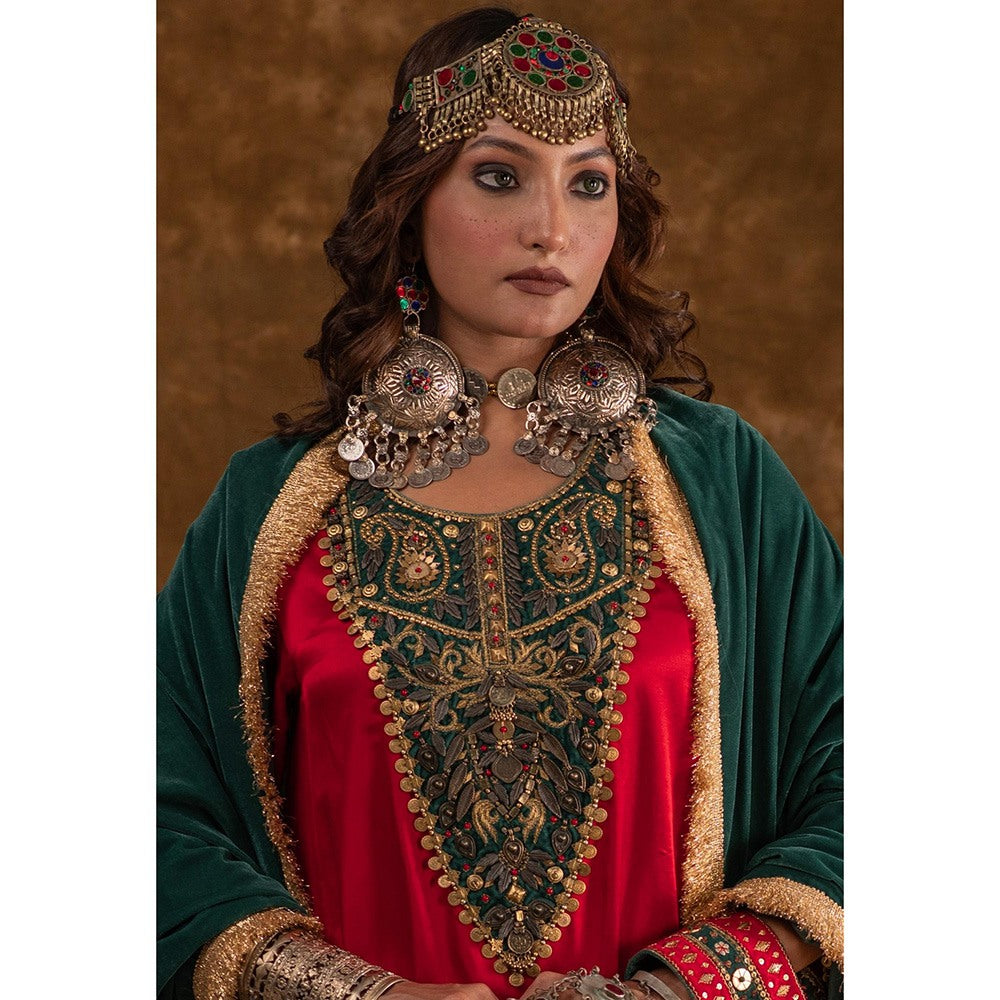 Description : This Elegant Suit Set From The Raahi Collection Is Crafted From Lustrous Mashru Silk, Handmade and Hand-Dyed In The Heart Of Kutch. The A-Line Kurta, In A Vibrant Red Base Color, Features Bell Sleeves and Practical Pockets, Paired with An Elasticated Salwar for Unmatched Comfort. The Highlight Of This Piece Is The Intricate Afghani Coin Work, Meticulously Crafted On Contrasting Teal Green Velvet Patch Adding A Striking Touch Of Tradition and Opulence.