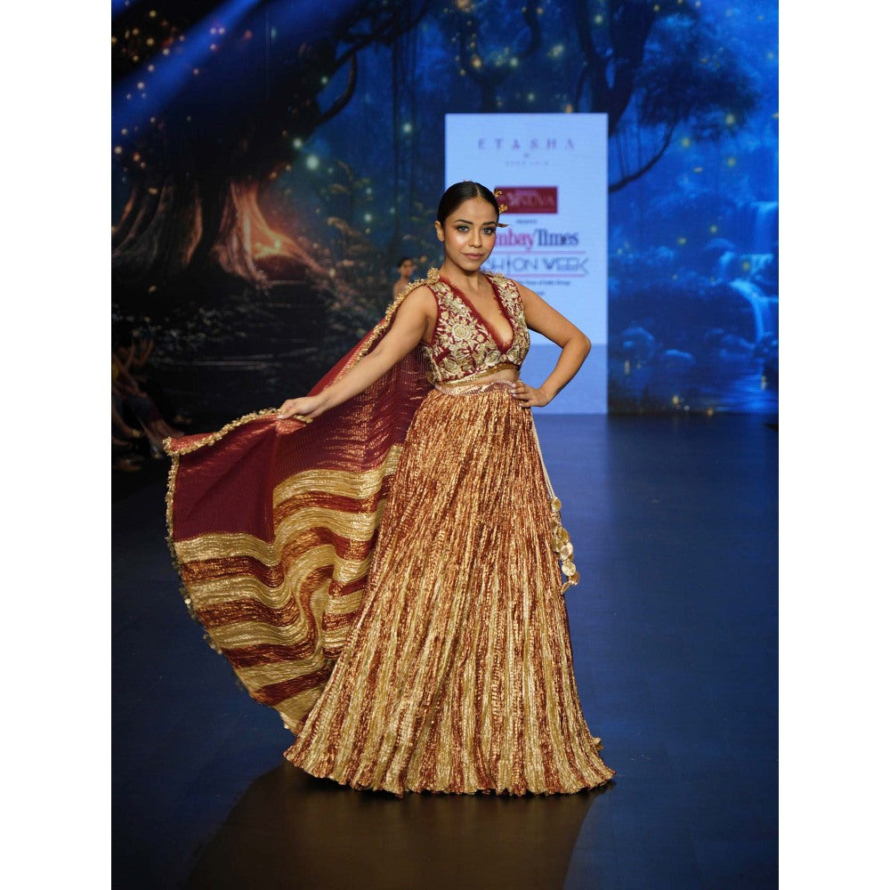 Description : The Rust And Shades Of Gold Textured Metallic Lehenga With The Maroon Zardozi Embellished Organza Blouse And Half Tissue And Hal Textured Metallic Dupatta