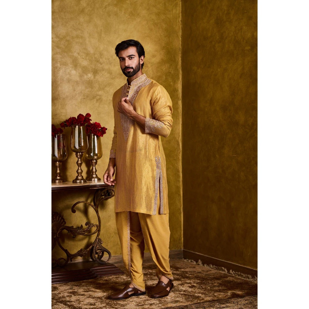 Chanderi Men Mustard Embroidered Kurta with Dhoti