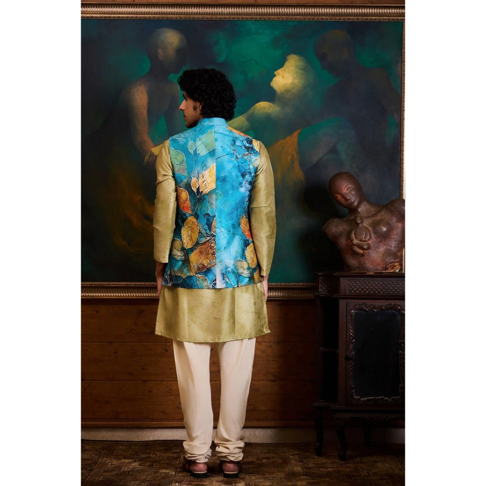 Description : Teal Olive Printed Poly Dupo ion Nehru Jacket And Kurta Paired With A Cotton Silk Churidar