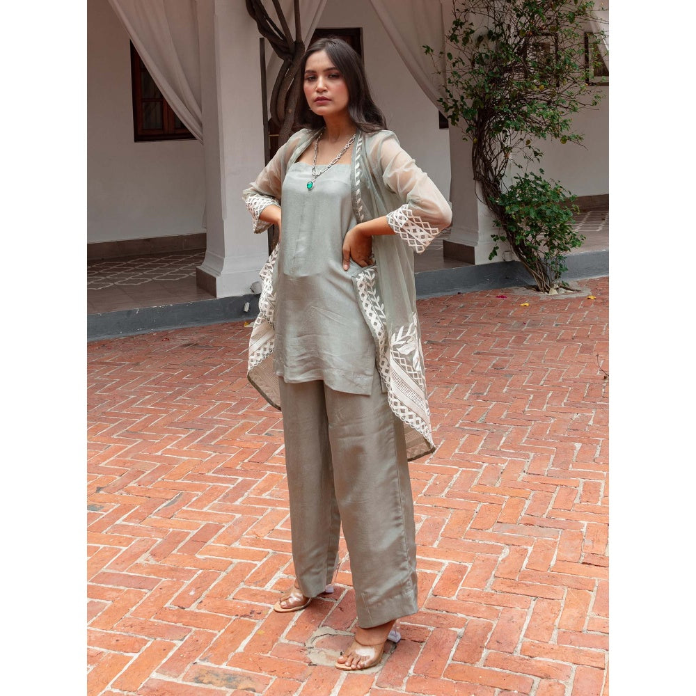 Description : Grey organza jacket embellished with kashmiri kashida embroidery paired with palazzo and short kurta.