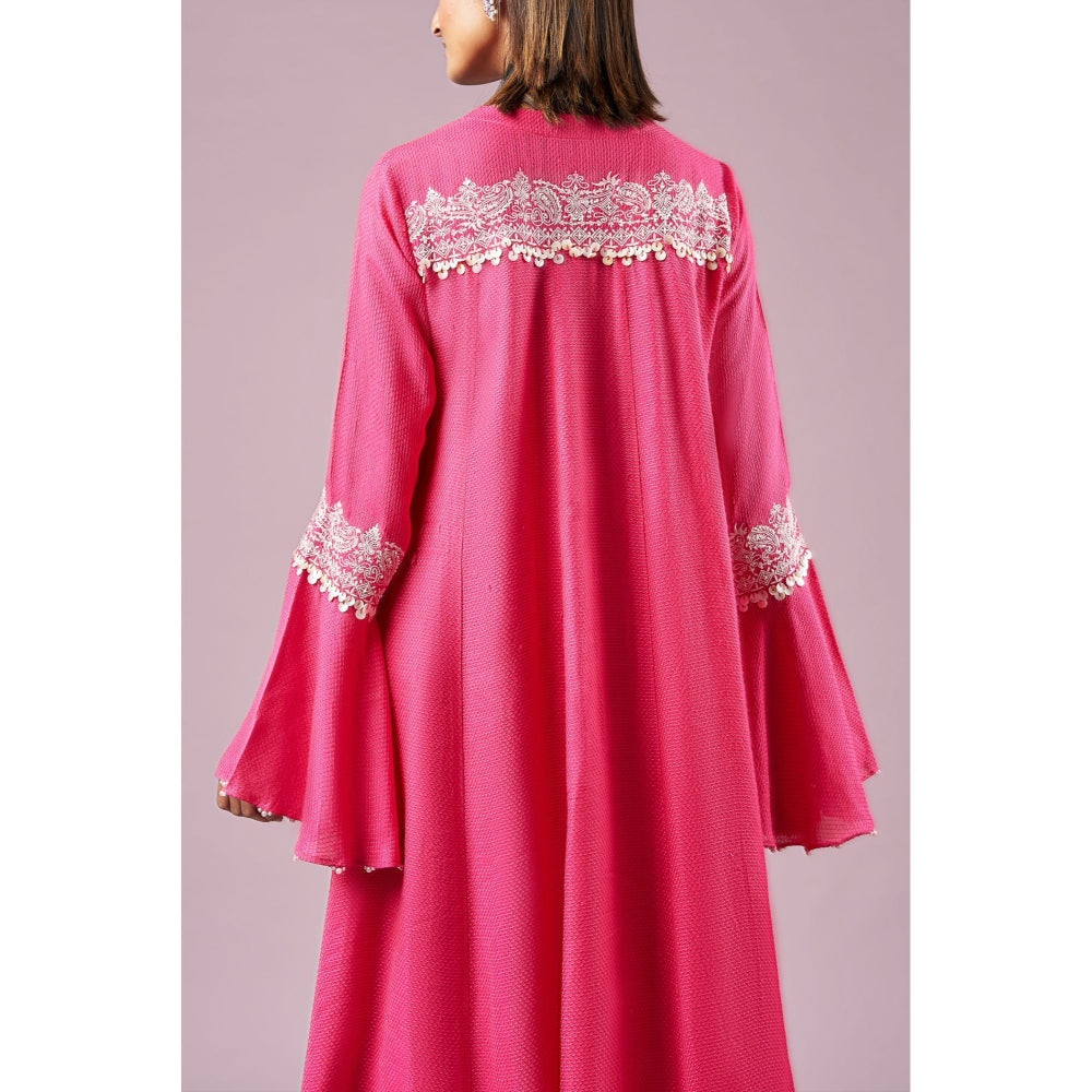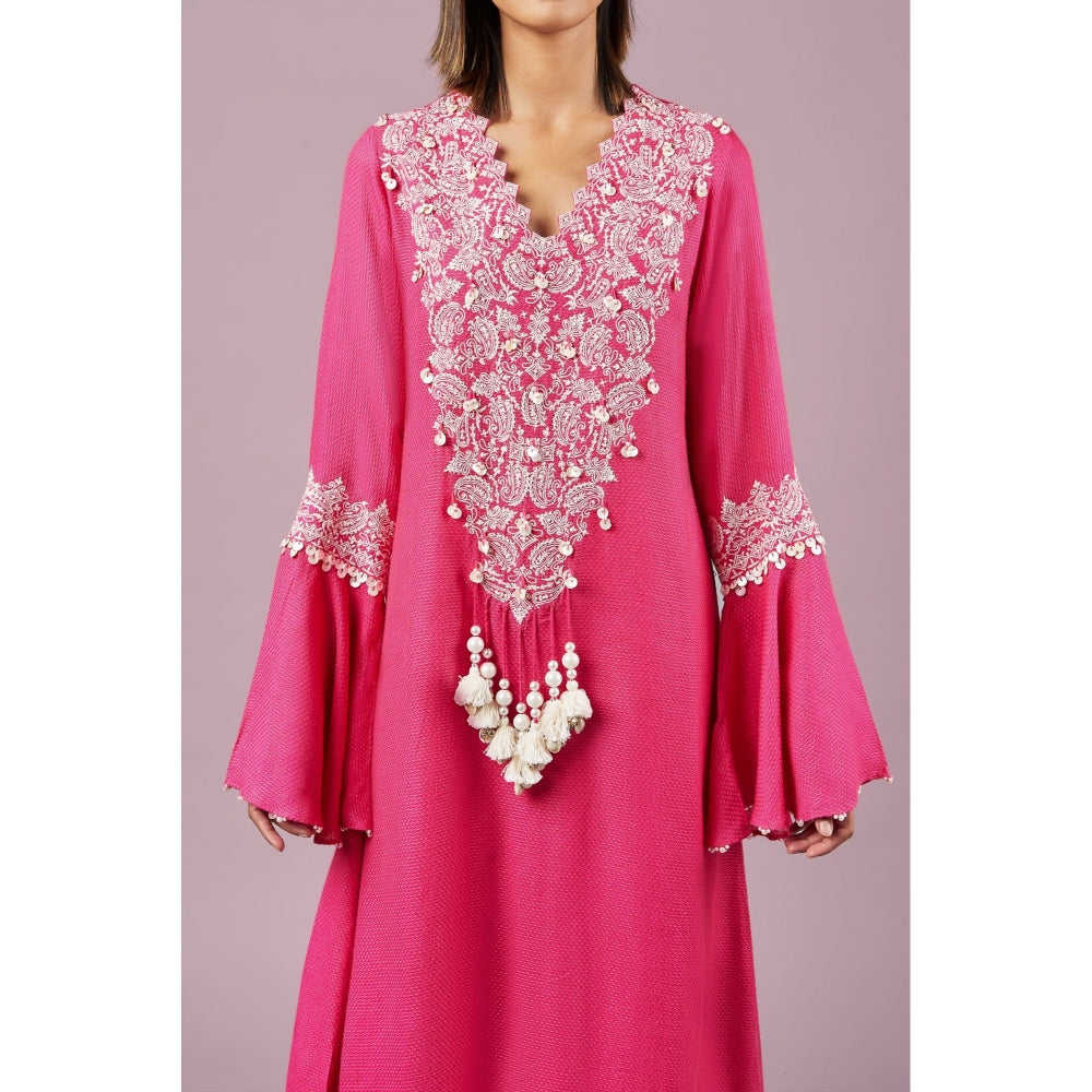 Description : This Kali suit is paired with plazzos. Sleeves are fitted on the bicep and are bell sleeves at the bottom. It has thread and pearl work on the neck and sleeves and is enhanced with tassels, shells and pearl drops.