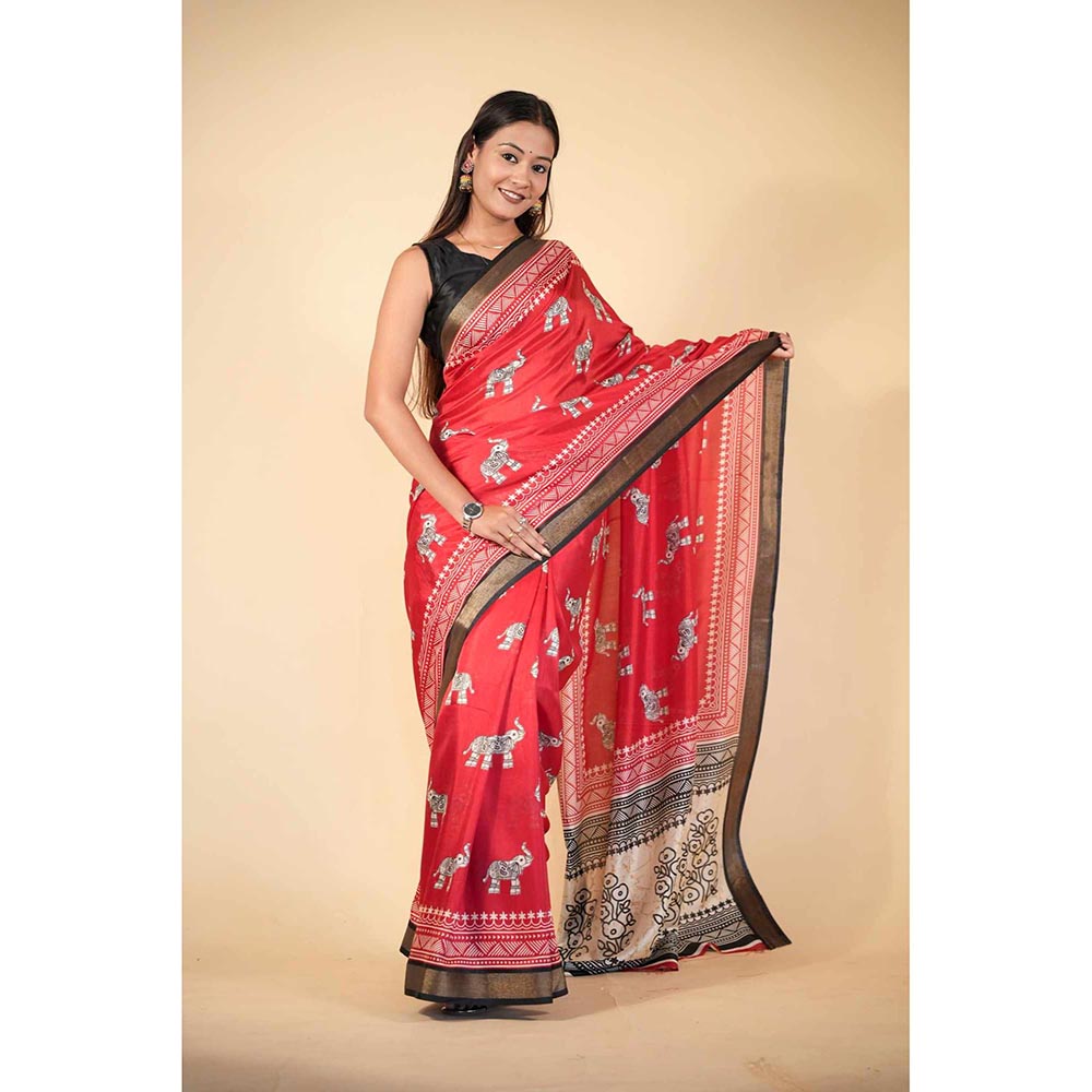 Red Printed Pre-Draped Saree with Unstitched Blouse