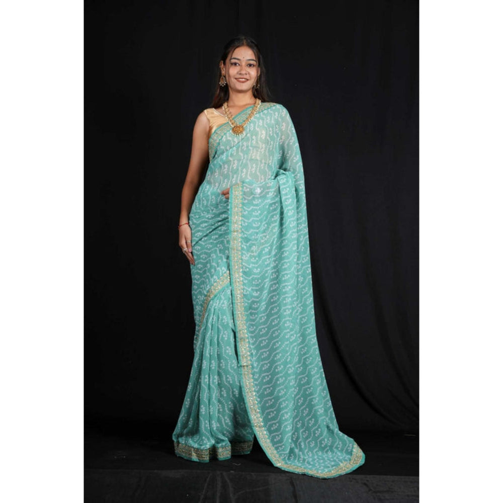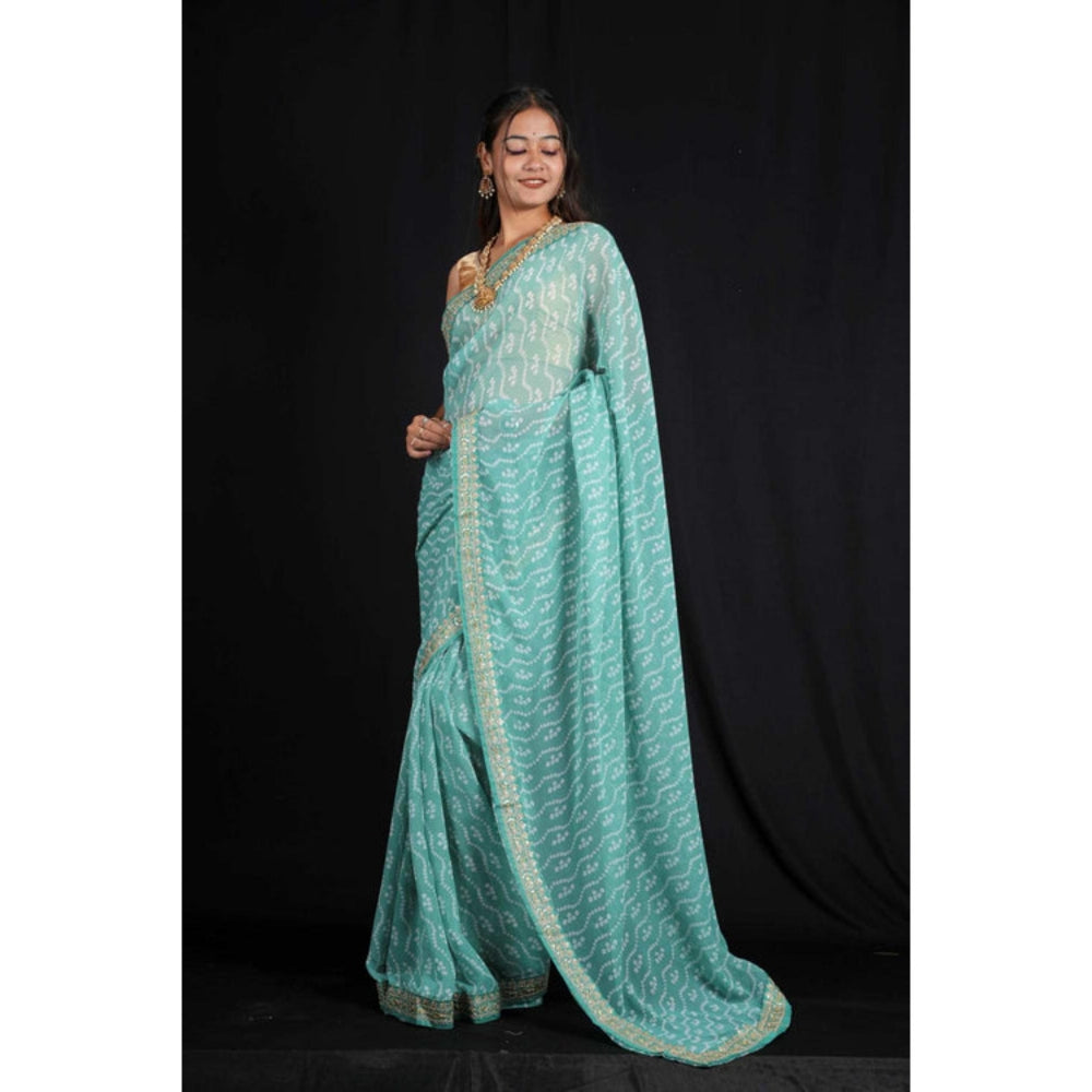 Womens Bandhani Printed Blue Pre-Draped Saree With Unstitched Blouse