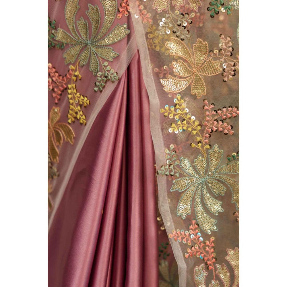 Womens Embroidered Sequined Pink Pre-Draped Saree With Unstitched Blouse