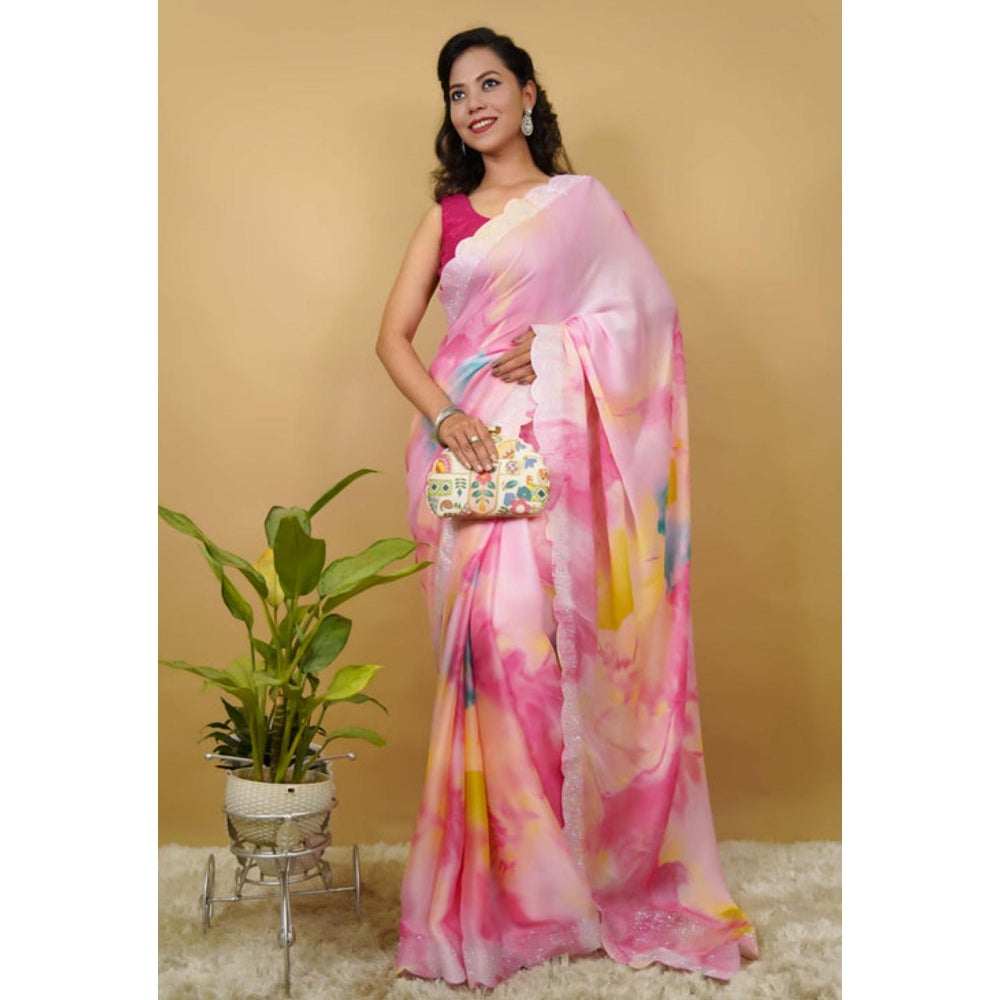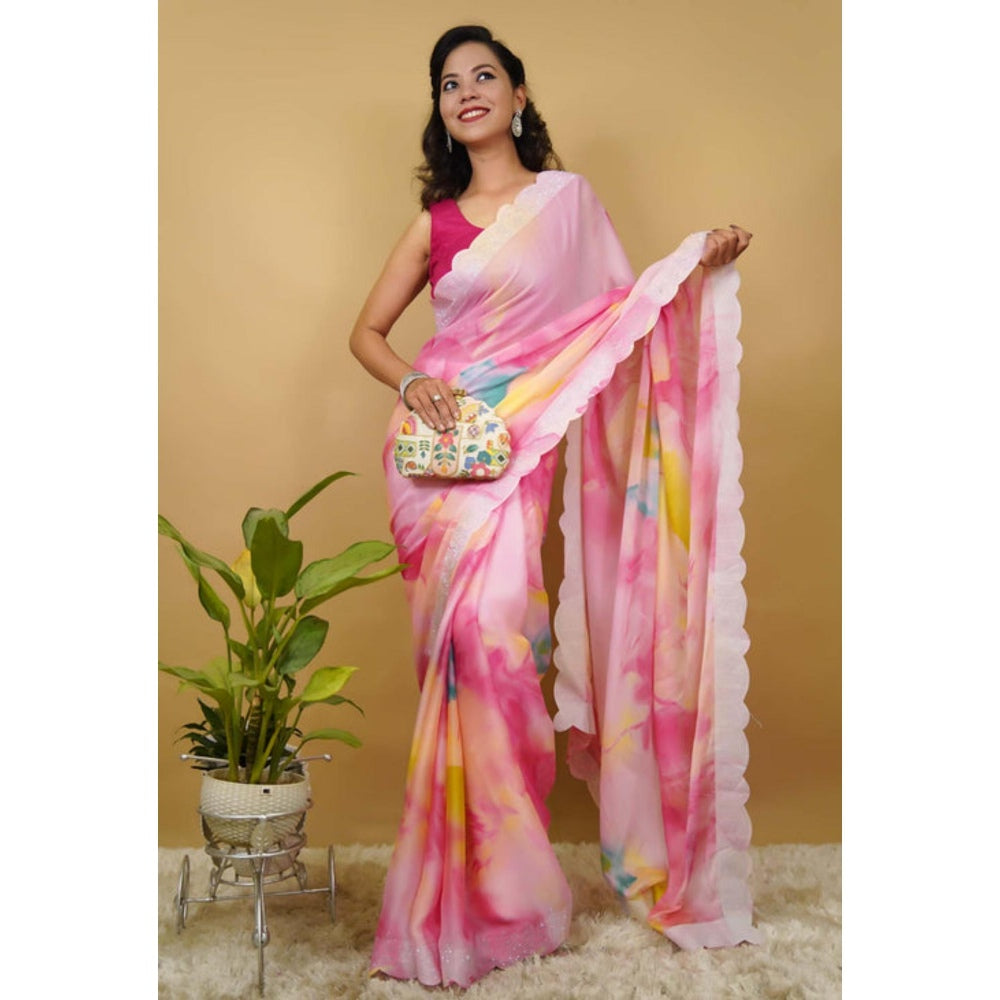 Womens Tie & Dye Sequined Pink Pre-Draped Saree With Unstitched Blouse