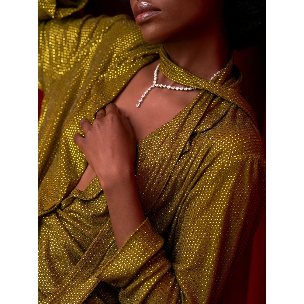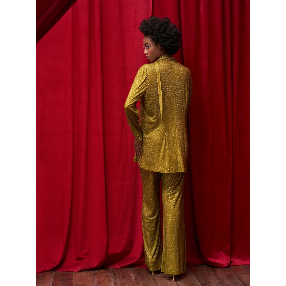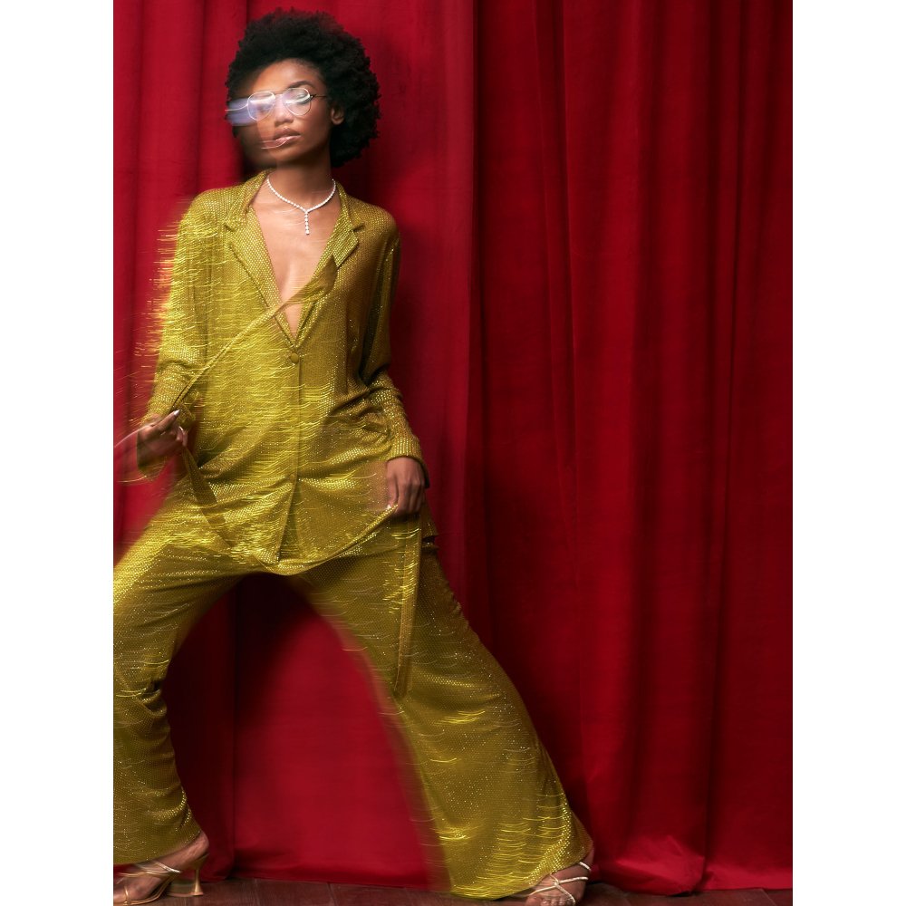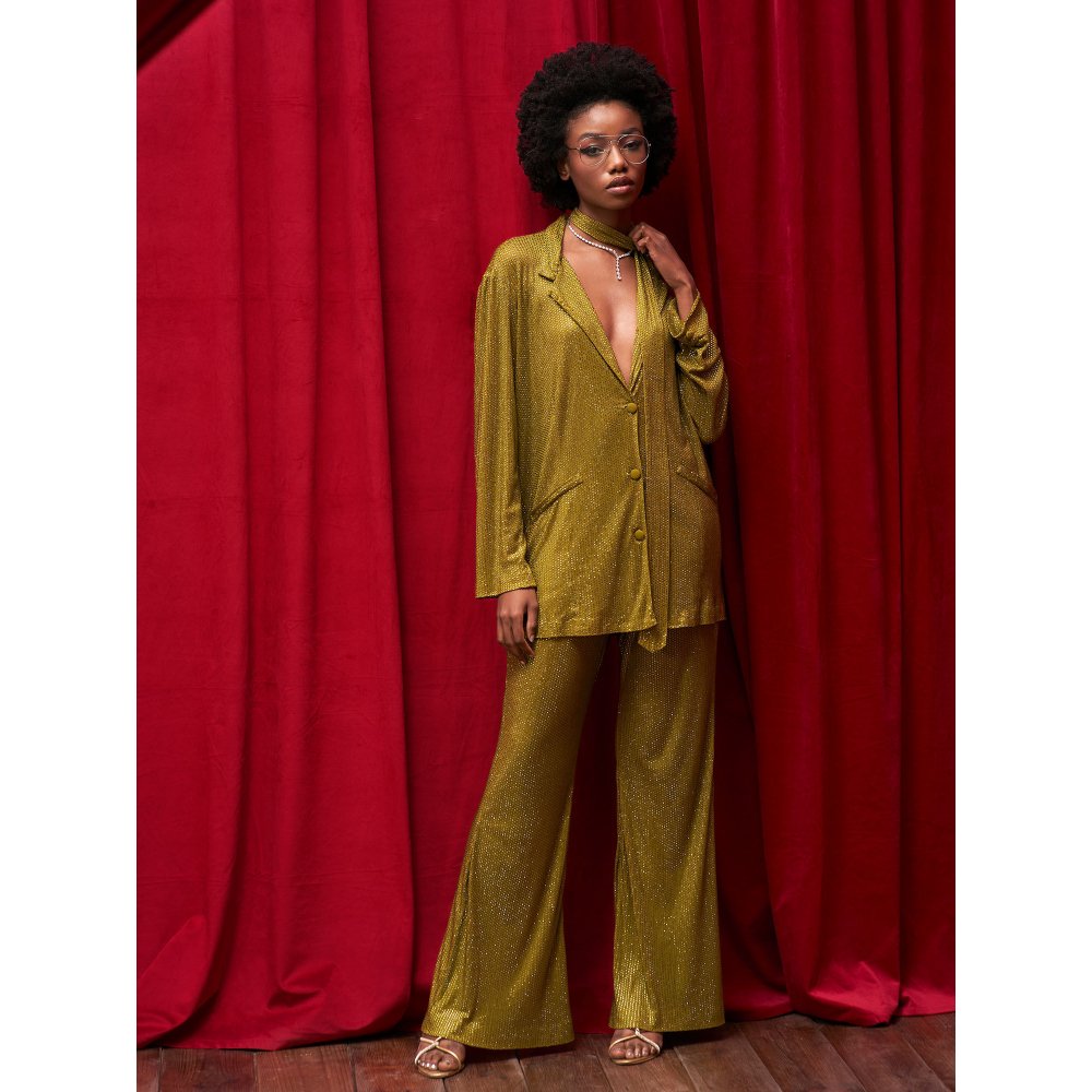 Description : Flaunt elegance by stepping out in this captivating olive crystal embellished jacket with belt paired with flared leg pant from Itrh. Made from high-quality net, this piece features full sleeves and a notched lapel collar. Style it with minimal jewellery and sandals to complete the ensemble.