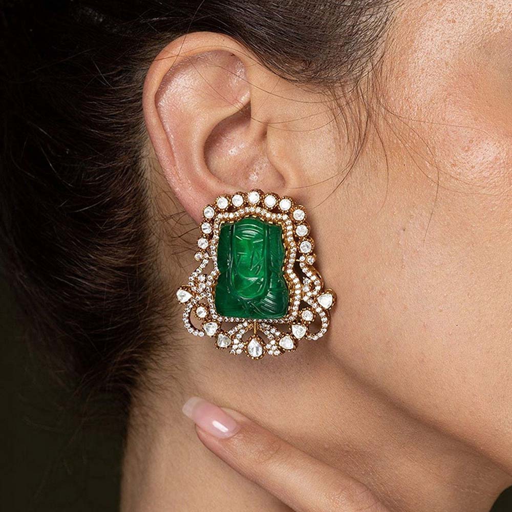 Description : Luxurious Stud Earrings Featuring A Central, Rectangular Carved Emerald Or Jade Gemstone. The Striking Green Stone Is Framed By A Delicate Border Of Glittering White Pearls Set In Rose Gold-Toned Metal.