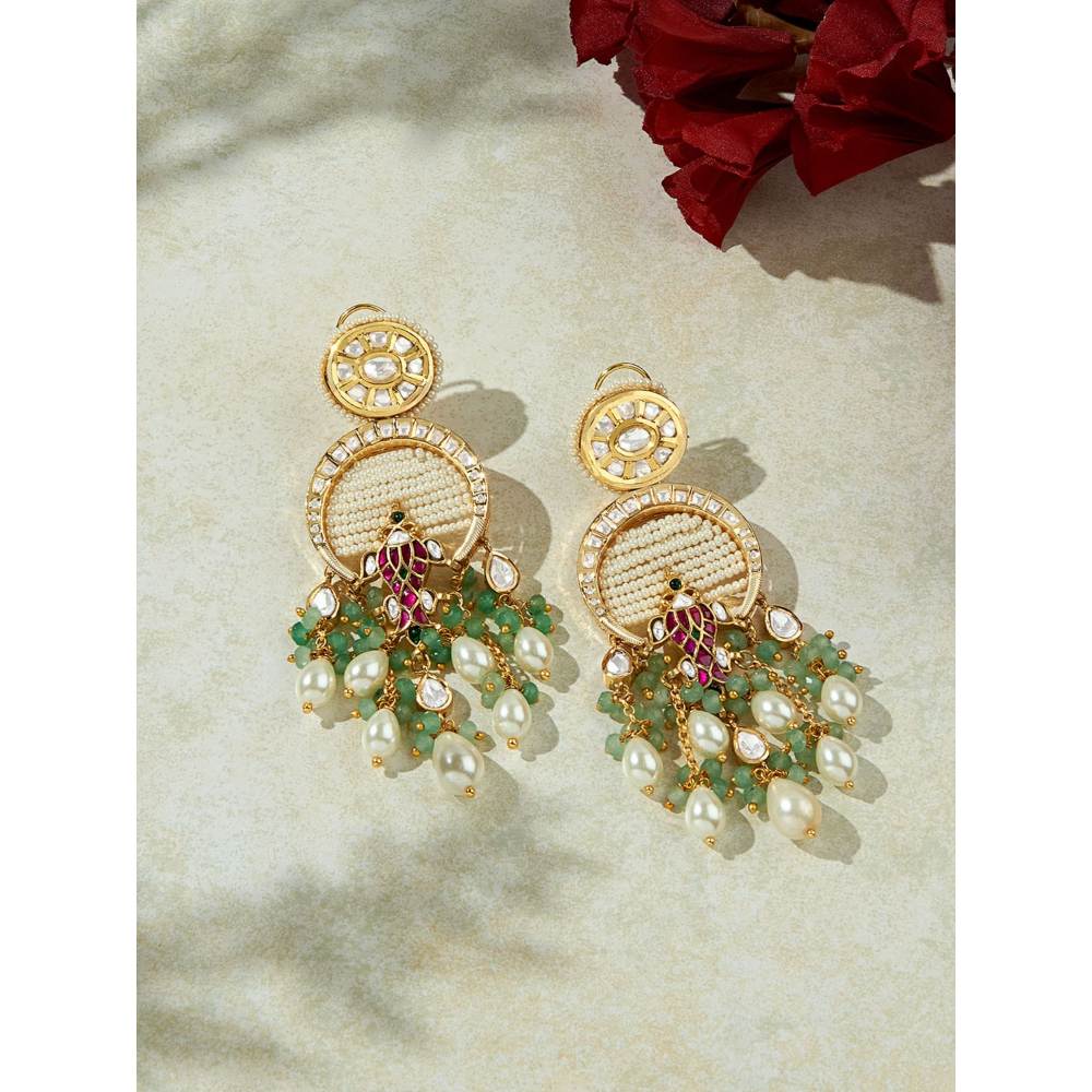 This designer chandelier earring is handcrafted with drop polkis & completed with beautiful strands of white clasic pearls with hydro & green beads. The beautiful motif in the centre is made with rich artisanal work of hydro rubies & emerlads.Ideal to be worn on festive, wedding & party occassions on your Indian & fusion attire.Every artistic piece from Joules by Radhika is made with real semi precious stones only, giving it a regal look & feel.