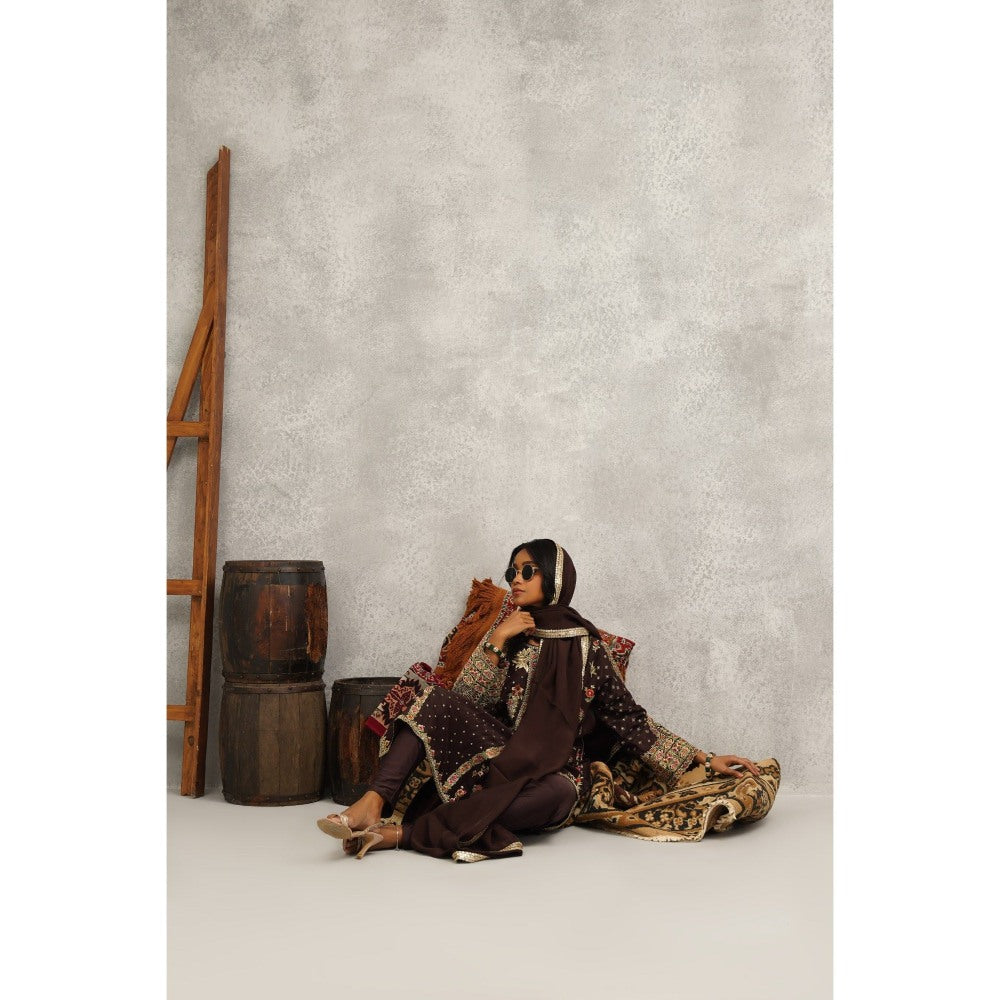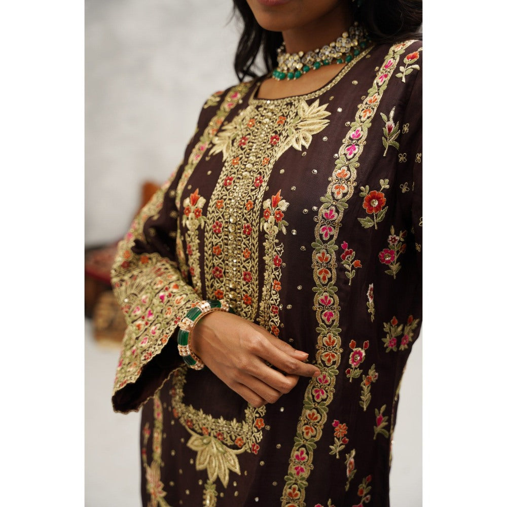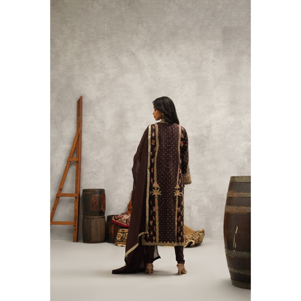 Kapda Dori Brown Embroidered Kurta with Churidar and Dupatta (Set of 3)