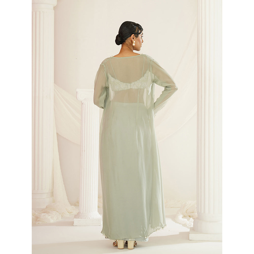 Sage Green Embellished Blouse with Skirt and Long Cape (Set of 3)