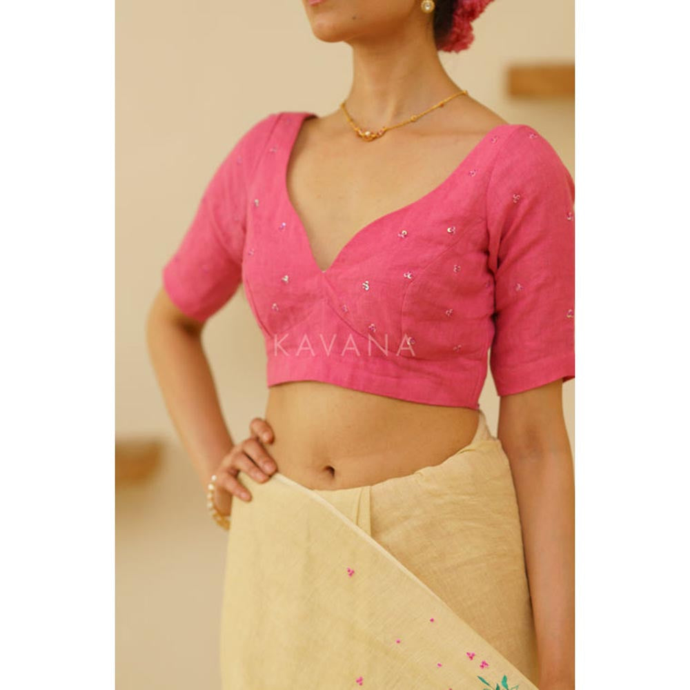 description : An elegant Princess cut blouse in pink, handcrafted in fine linen with sequin work . Fabric drawstring with tassel details. Team up with a linen sari or any sari of your choice to complete your look.