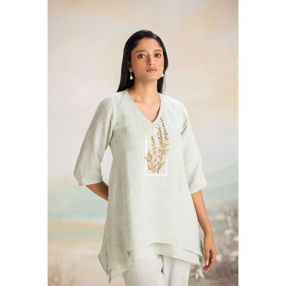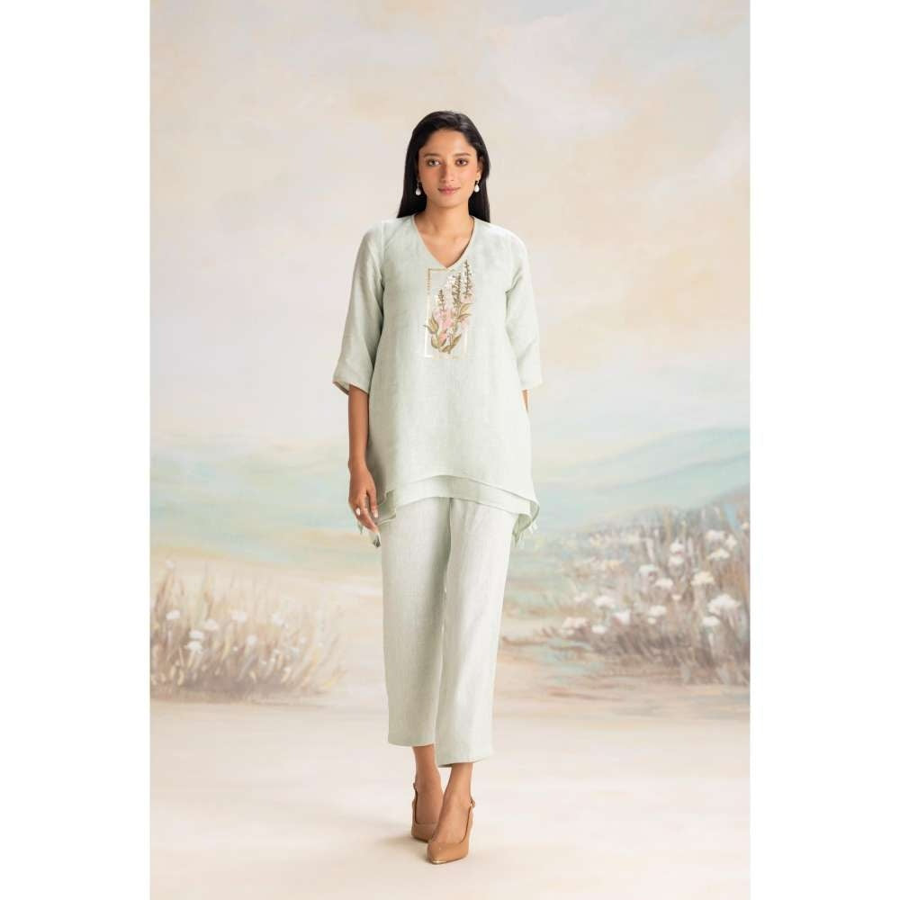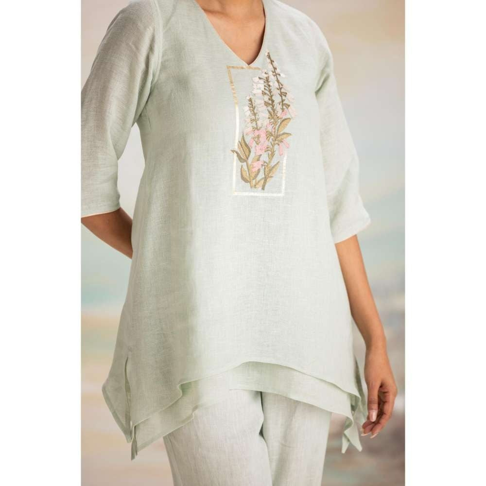 Description : 100% Linen Top Length 29" / Pant Length 35a / Model Height 5'9'' A Fit And Flare, Two Layer, V - Neck Top - Edged With Interesting Finishes With A Touch Of Gold Giving The Perfect Balance Delicate Pastel Floral Embroidery In Cotton Threads, Inspired By The Angel's Trumpet Flower, Blooming Out Of A Timeless Golden Frame. Relaxed Fit Machine Wash Cold