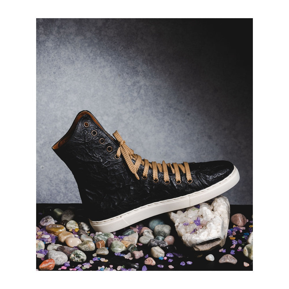 Description : These tall sneakers, oozing with raw energy, are handmade from black crinkled leather with a matte finish. The top line of the boots is curved high in the front and the midsole is attached with raw, wide stitching. Completed by a white thick outsole and broad, metallic beige laces, the sneakers exhibit a gallant aura.