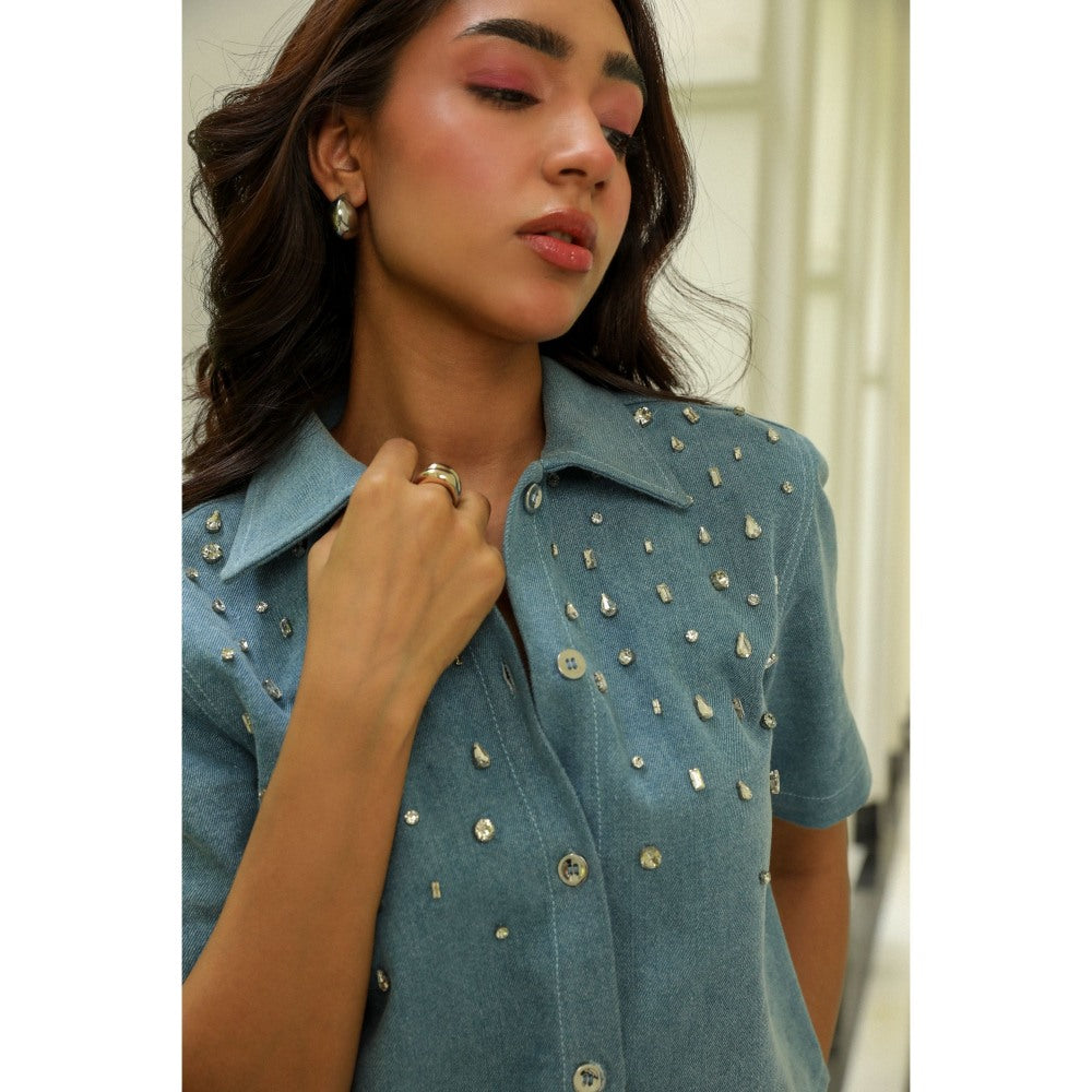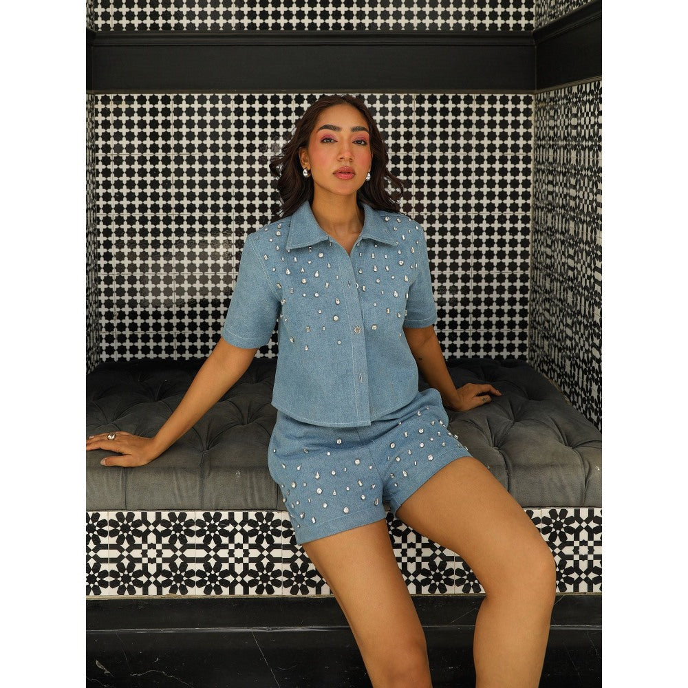 Description : A Denim Co-Ord Set Featuring Silver Stone Embellishments On The Collar And Bottom Of The Shorts, Combining Stylish Flair With Exceptional Comfort
