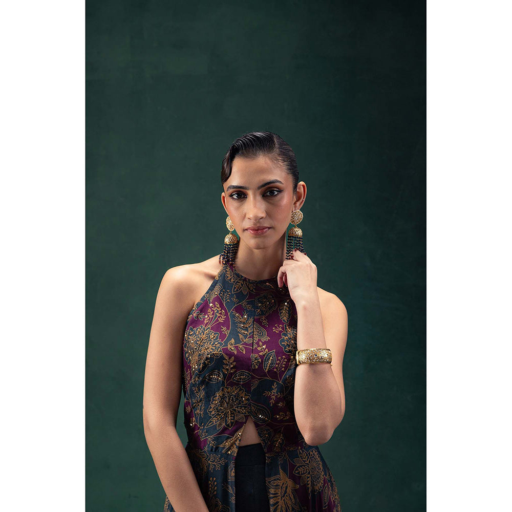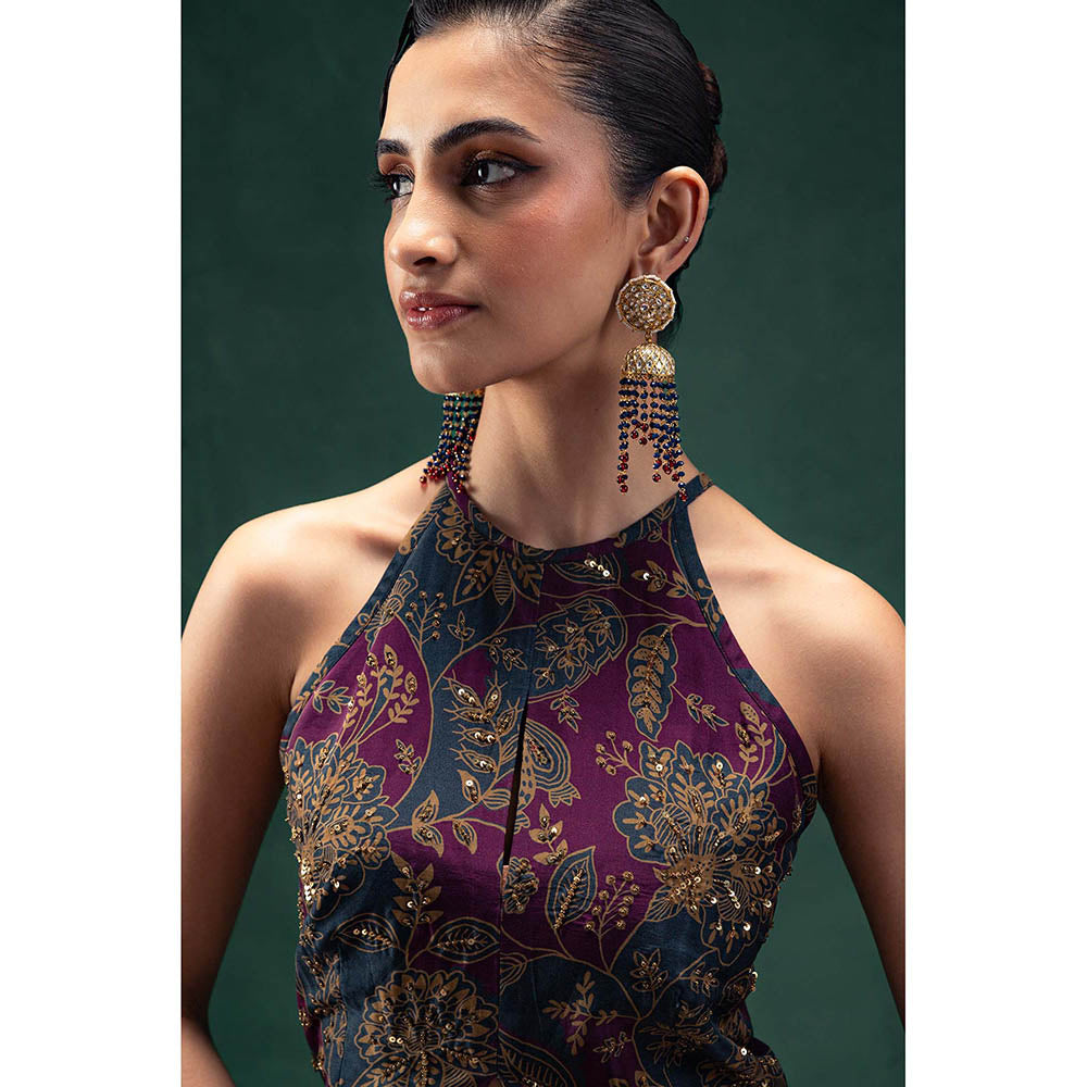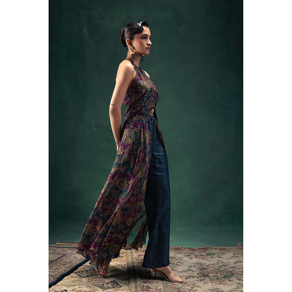 Description : Our Laila Ensemble Features A Halter Neck Silk Floor-Length Kurta Showcasing A Striking Purple And Blue Abstract Floral Print. Delicate Gold Handwork Embellishes The Floral Motifs Around The Bodice, Enhancing Its Opulent Feel. The Silk Kurta, With A Centre Slit Detail, Flows Beautifully With Every Movement, Complemented By Elegant Raw Silk Blue Straight Pants For A Refined Finish.