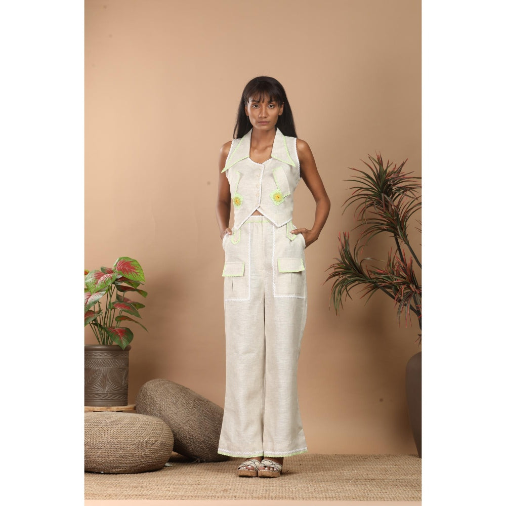 Description : Cargo street style set with lace details all over, cute daisy patches on the top and pockets with medium flare high waist pants