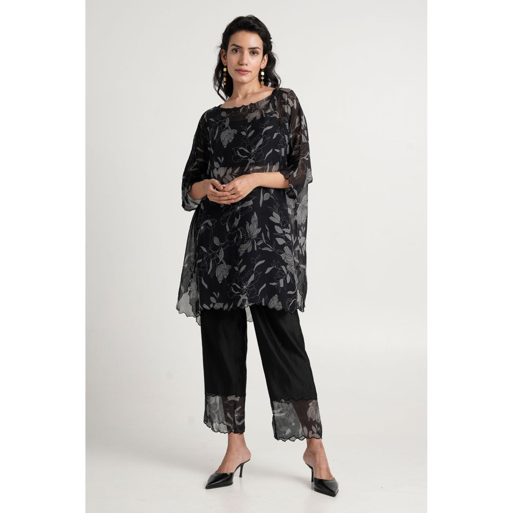Description : Step into the world of effortless style with this black co-ord set from Madder Much. Made from high-quality fabric, the top features three fourth sleeves, a round neck and a floral pattern, finished with a mid-waisted pant and a fancy bustier. Style it with minimal jewellery and sandals to complete the ensemble.