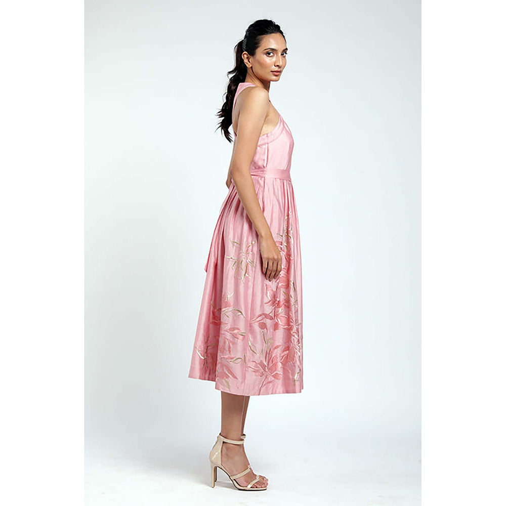 Peach Chanderi Halter Neck Floral A-Line Midi Dress