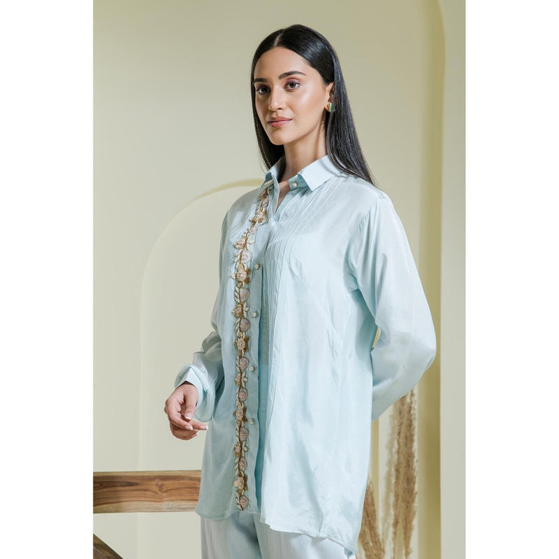Maive Powder Blue Hand Embroidered Modal Satin Shirt