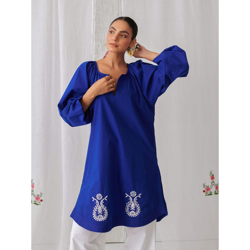 Description : This Royal Blue, Short, Softly Gathered Kurta Features Delicate Thread Embroidery Motifs At The Hem. With A Flattering Keyhole Neckline And Balloon Sleeves, It Combines Elegance And Ease. Paired With Relaxed White Cotton Palazzo, Finished With A Curved Hemline, Ita S The Perfect Blend Of Comfort And Style.