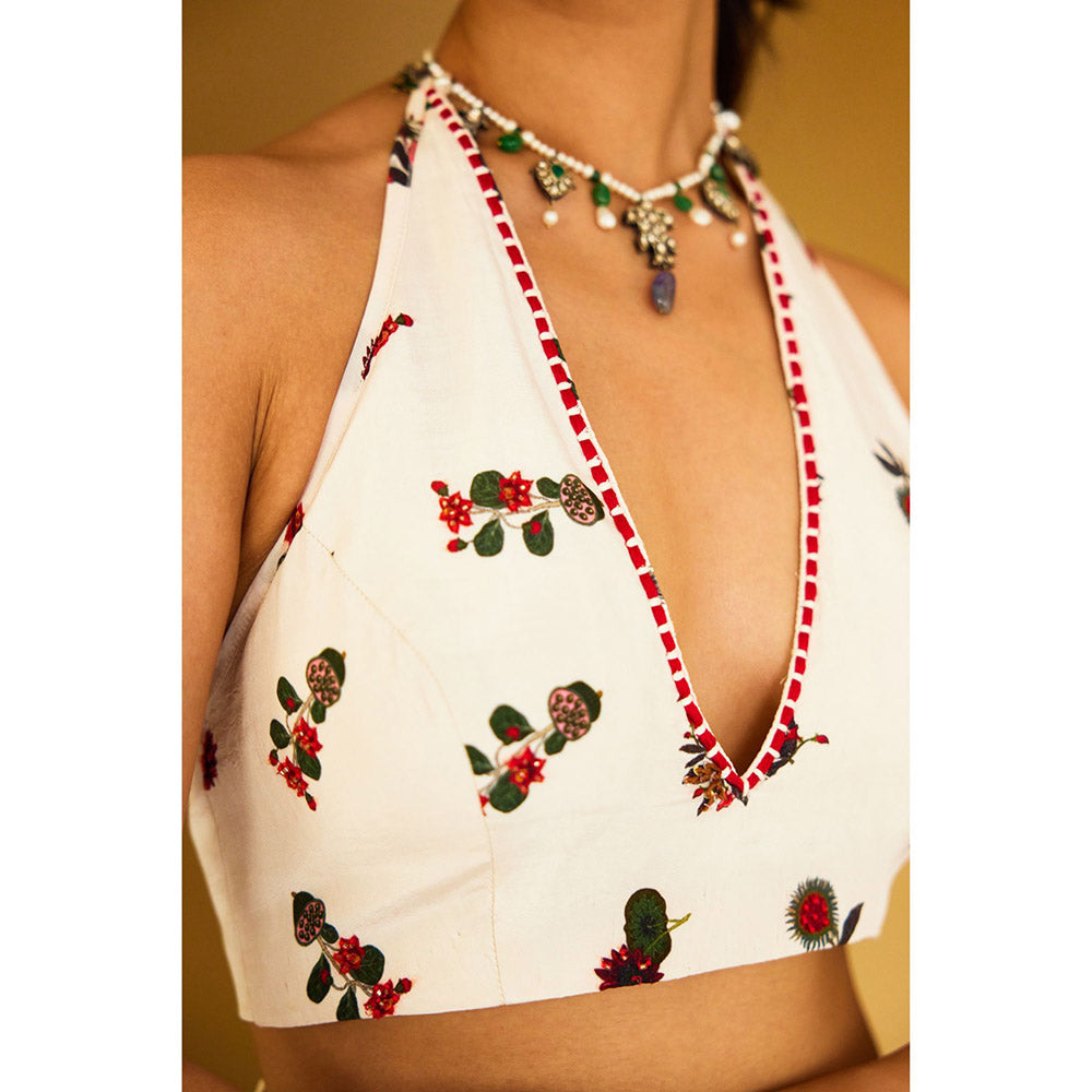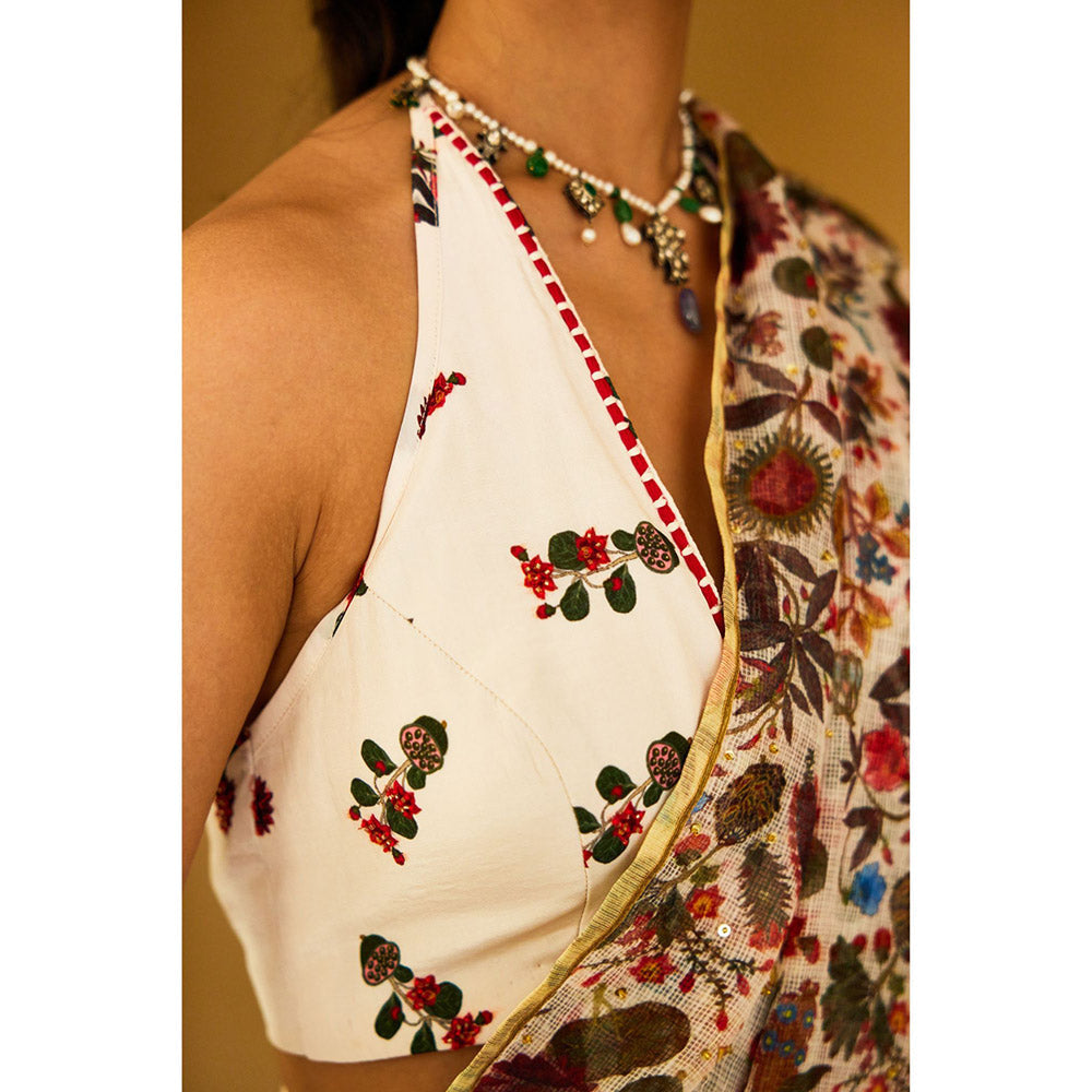 Description : Ivory handwoven kota doriya kohinoor buta print saree attached with ivory viscose crepe dhoti paired with embroidered kohinoor buta print viscose crepe blouse