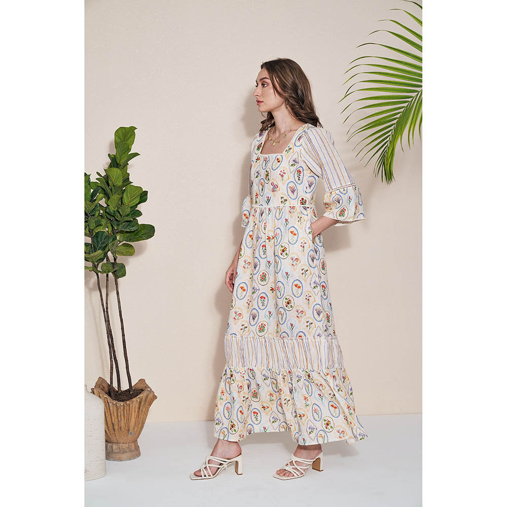 Description : This Maxi Has An Easy Silhouette Decorated With All Over Floral Print. A Multi-Tiered Dress Made In Fine Pure Hemp Fabric, Adorned With Hand Embroidery On Bodice & Lace Details On Neck, Sleeves And Waist, Fastened With Conceal Side Zip For Closure. Style With Dainty Gold Jewellery And Small Clutch.