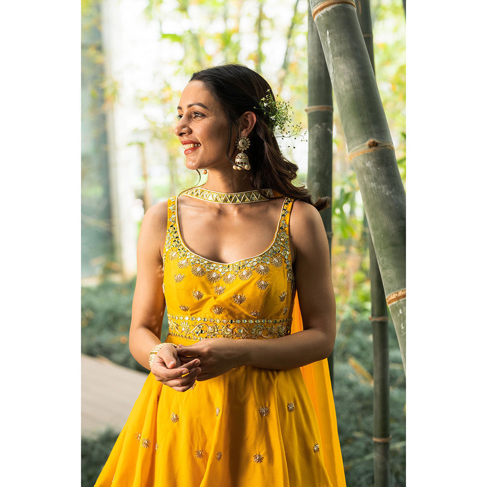 Description : Elevate your ethnic wear wardrobe with Rashika Sharma yellow kurta, sharara, dupatta. It features embellished & sequined pattern with sleeveless, round neck design with flared high waist bottom style. It is crafted from finest material. This outfit is perfect for special occasion. Add trendy footwear to complete the look.