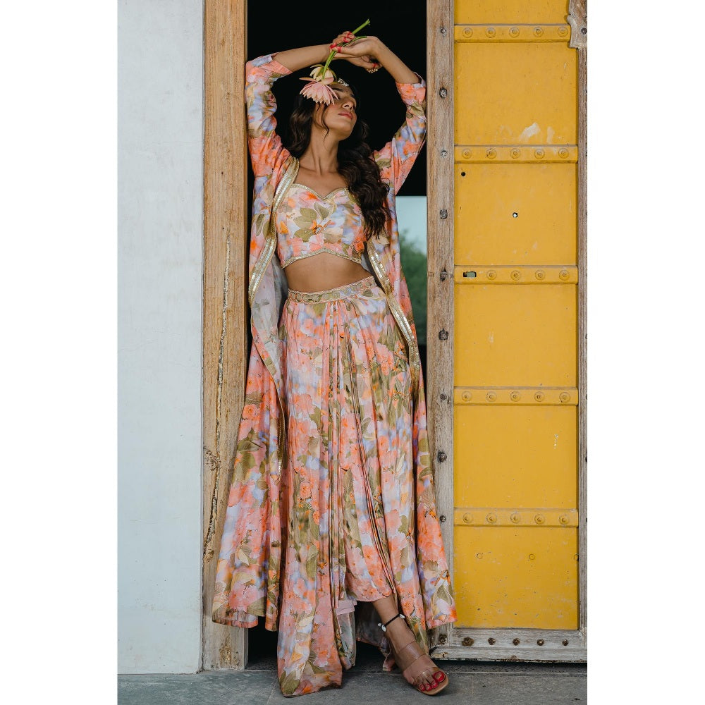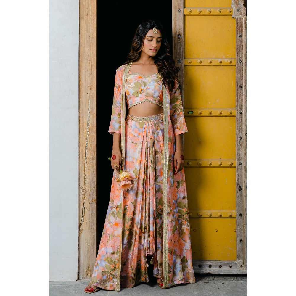 Redpine Designs Peach Printed, Embroidered Long Jacket with Skirt and Blouse (Set of 3)