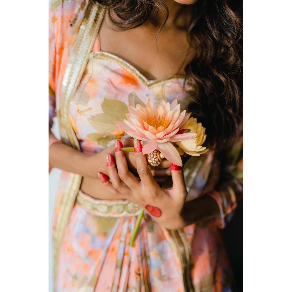 Description : Featuring Peach Printed Long Jacket & Skirt In Raw Silk And Crepe Base With Saadi, Kasab, Moti And Sequins Hand Embroidery. It Is Paired With Embroidered And Printed Raw Silk Blouse And Long Jacket.