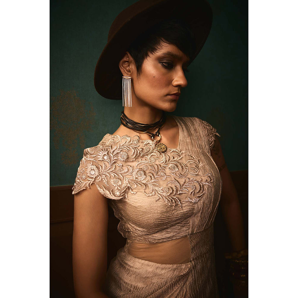 Description : A Stunning Baby Pink Draped Crinkle Tissue Straight Gown Featuring A Shoulder Pallu Illusion And Intricate Zari Embroidery With Patria Highlights In Tonal Patterns. The Subtly Visible Waistline Adds A Bold, Sultry Edge To This Glamorous Look!