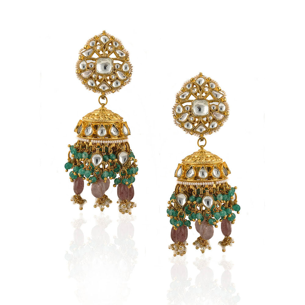 Jhumki In Moti Work and Pastel Pink Beads With Light Green Hangings