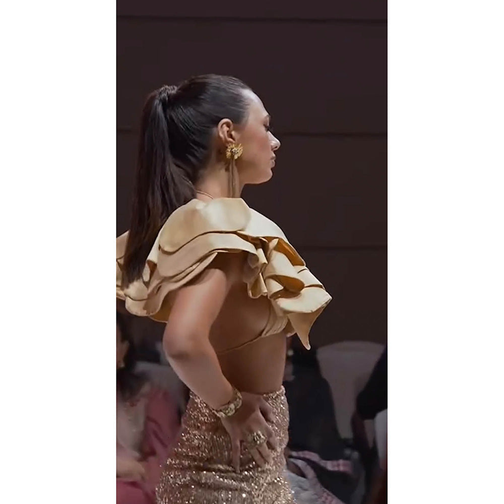Description : A Sculptural Ruffle Cape Top In A Soft Neutral Tone, Featuring Cascading Layers For Dramatic Movement And Dimension. A Bold Statement Piece That Pairs Effortlessly With Sleek Separates