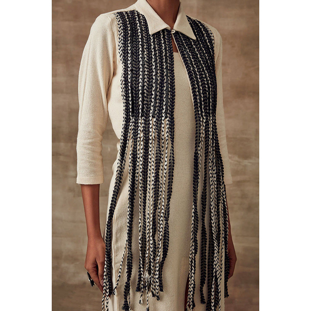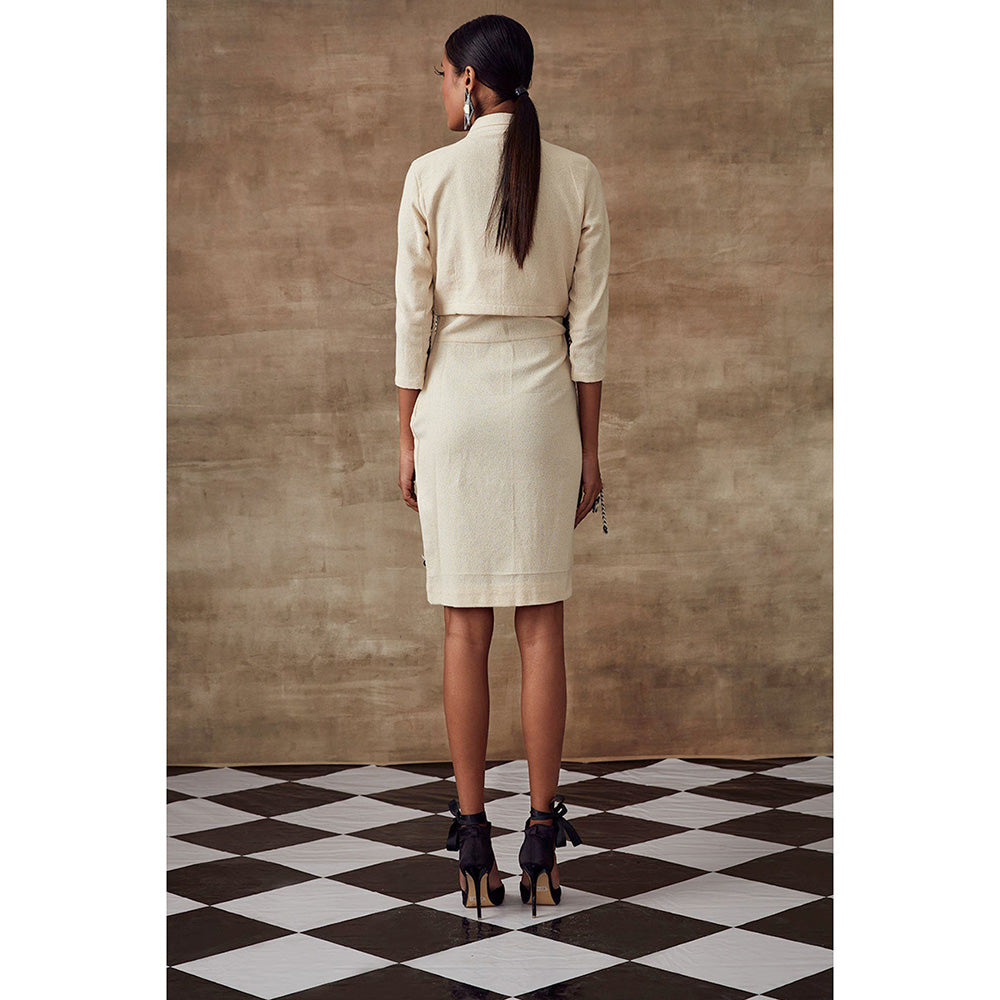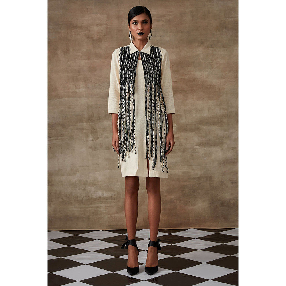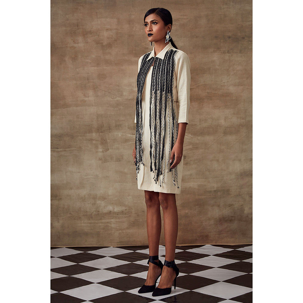 Description : Featuring A Short Jacket Essembled With Intricate Workmanship With The Play Of Dories Paired With an organic cotton short dress