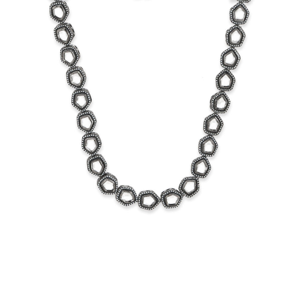 Description : The symphony of silver-plated metal and white crystal-like faux stones portrayed in this necklace is an impeccable piece of art. The seemingly simple yet intricate arrangement of glossy stones in the necklace is meant to leave the eyes open and jaws dropped at any occasion imaginable. The entire necklace is bedecked with the stones meticulously placed together that creates an eye-catching design. Each arrangement consists of a pentagon-shaped white faux stone ensconced by a silver-plated metal border. This is further embraced by a series of tiny faux stones that glitter all around the neck. The necklace comes tucked safely inside the signature Ruby Raang box.