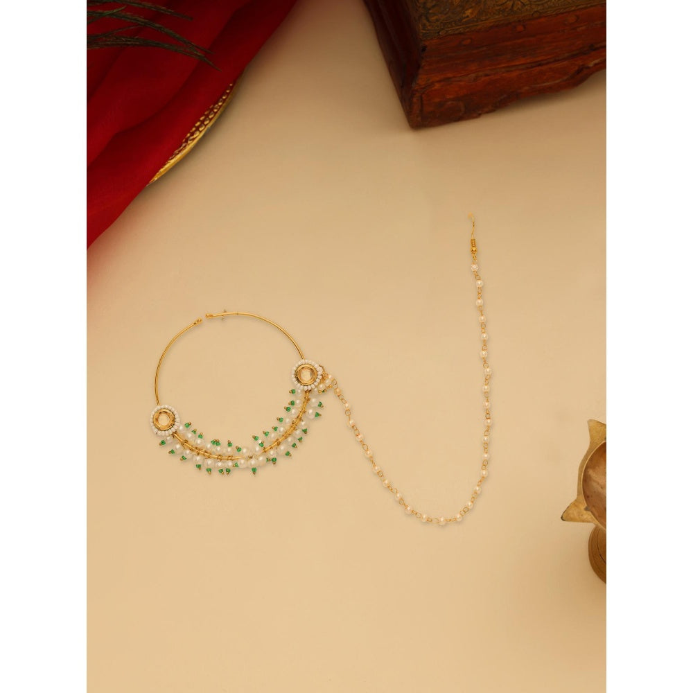 Ruby Raang Studio White and Green Beads Kundan Maharani Nose Ring