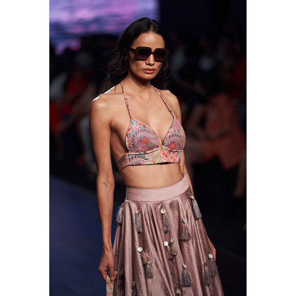Description : Enhance your style with this fancy pink co-ord set from RV Pret. Made from high-quality crepe, the blouse features a sleeveless design and shoulder straps. It is paired with a fancy skirt. Style it with minimal jewellery and sandals to complete the ensemble.