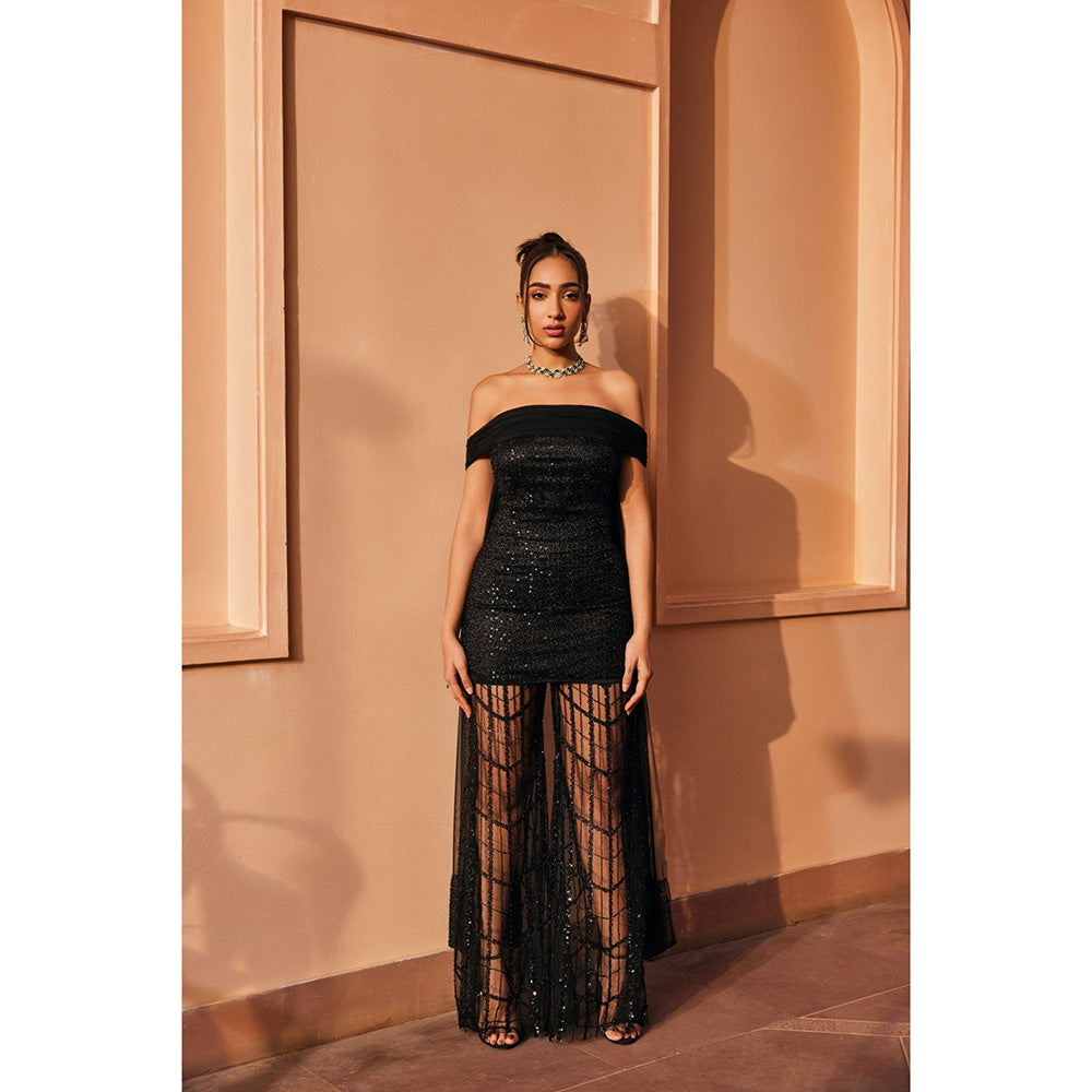 Description : Flaunt elegance by stepping out in this captivating aayat black embroidered multi way co-ord set from Saanjh by Lea. Made from high-quality sequin, this piece features a sleeveless design and an off-shoulder neckline. Style it with minimal jewellery and sandals to complete the ensemble.